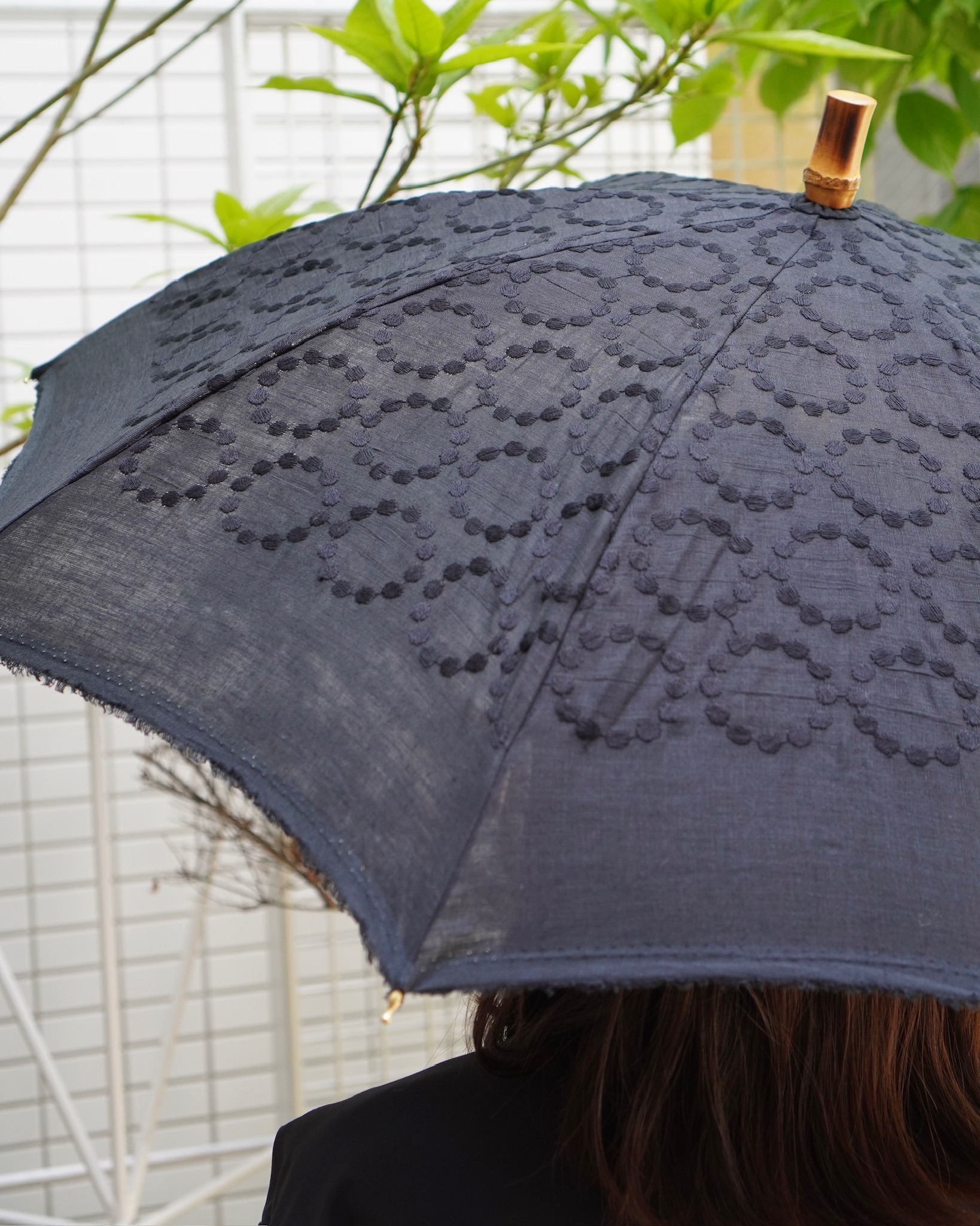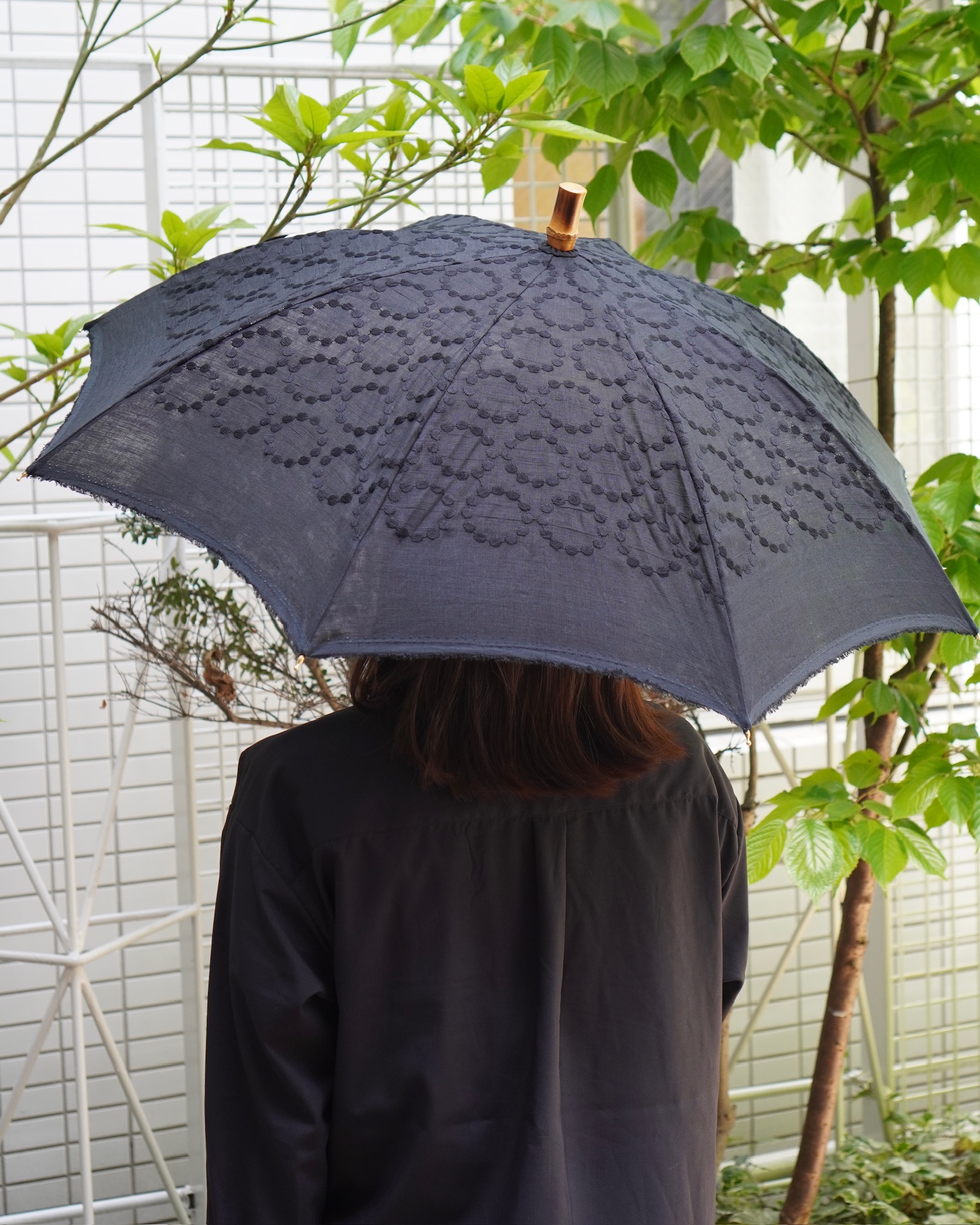 風合いや素材感がナチュラルな日傘。水玉で作られた輪っかの刺繍が黒の生地に馴染んで大人かわいい!天然のバンブー素材の持ち手の持ちやすさも◎熟練の職人さんたちの丁寧な手仕事によって作り上げられました。紫外線防止加工も施しており、暑い夏の日も涼しく感じられます。