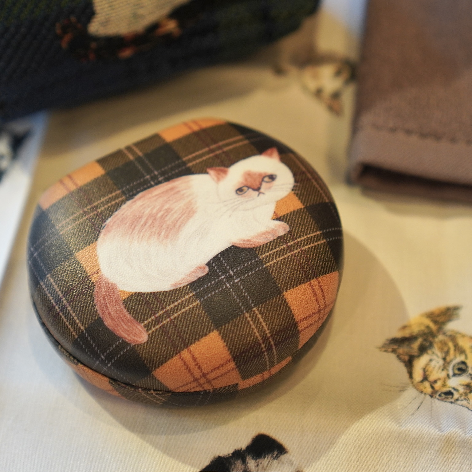 手のひらサイズのハードケースは、繊細なアクセサリーやイヤホンなど、小物の収納にぴったり!内側には鏡も付いているので出先でのアクセサリーの付け外しにも役立ちます。落ち着いたカラーリングと猫の表情もまた魅力!
