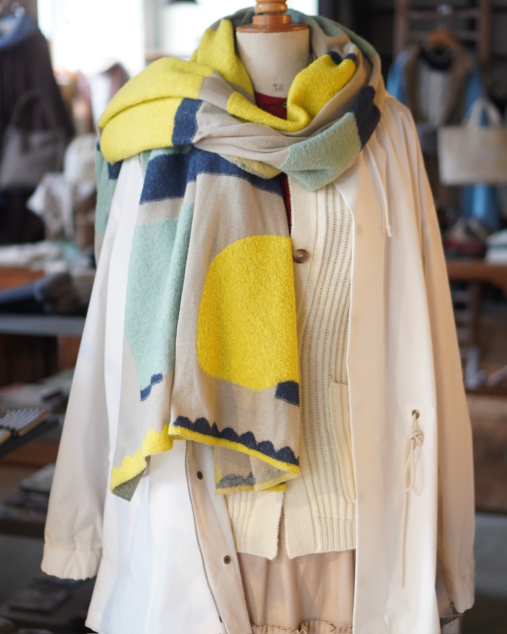 雪降る米沢の家々の屋根に降り積もった、ふっくらとした雪の形をテキスタイルに落とし込んだユニークなデザイン。素材は綿の分量が多く、薄手のタイプ。サラリと軽やかに使っていただけます。朝晩の冷え対策に、夏は冷房対策に、秋冬は寒さ対策にと通年を通して活躍できるストールです。