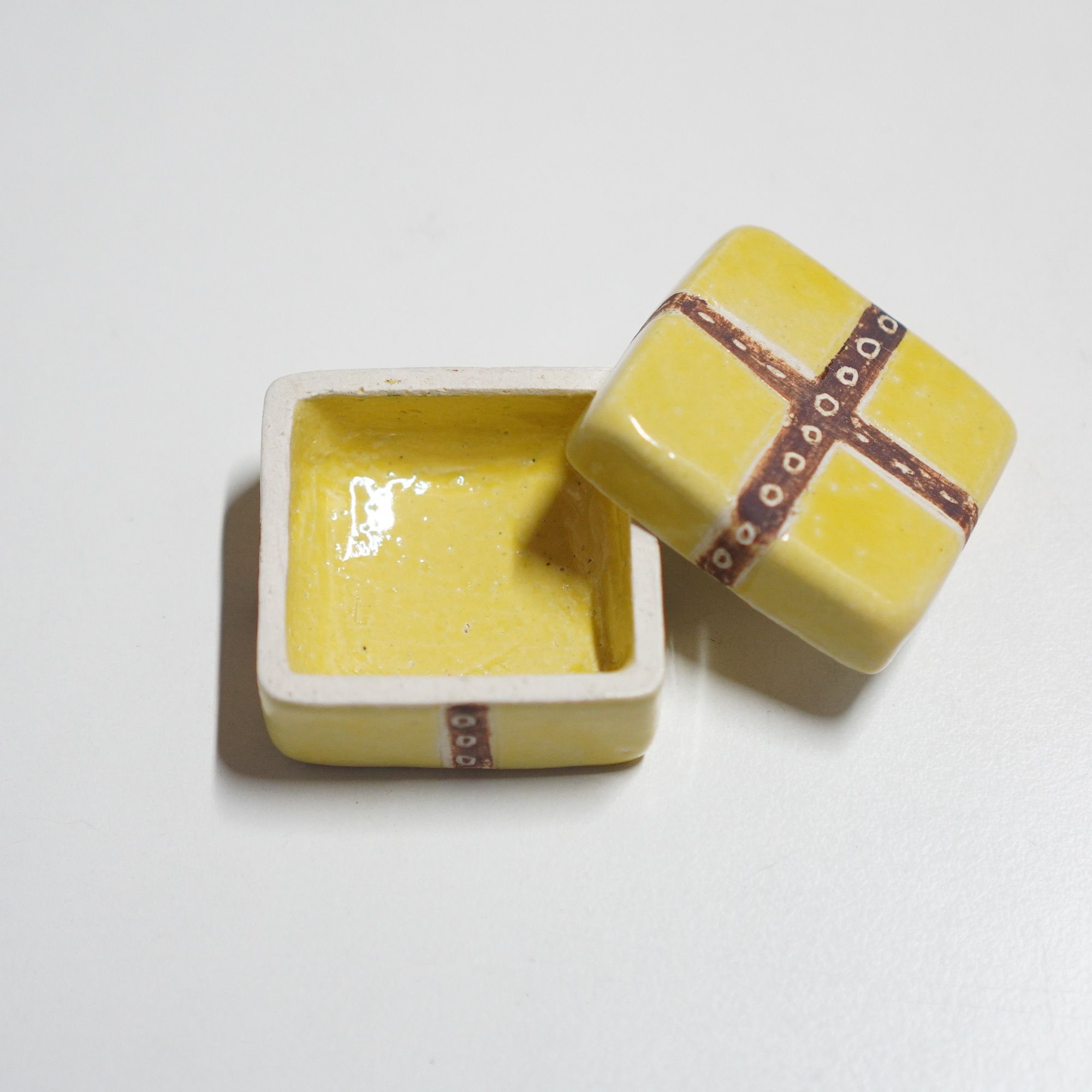 なにげない日常にひっそりと寄り添えるような陶器ならではのぬくもりを感じる作品。手仕事から生まれる模様の線、モチーフの表情などひとつひとつ違った風合い。土の素朴なあたたかさが、心にほっこりと癒しを与えてくれます。自然と触れたり、本を読んだり音楽を聴いたり、、、毎日の暮らしの中から生まれたアイディアをカタチにして日々、制作されています。ワクワクした気持ちでまた開けたくなる、お気に入りの小箱が見つかりますように。