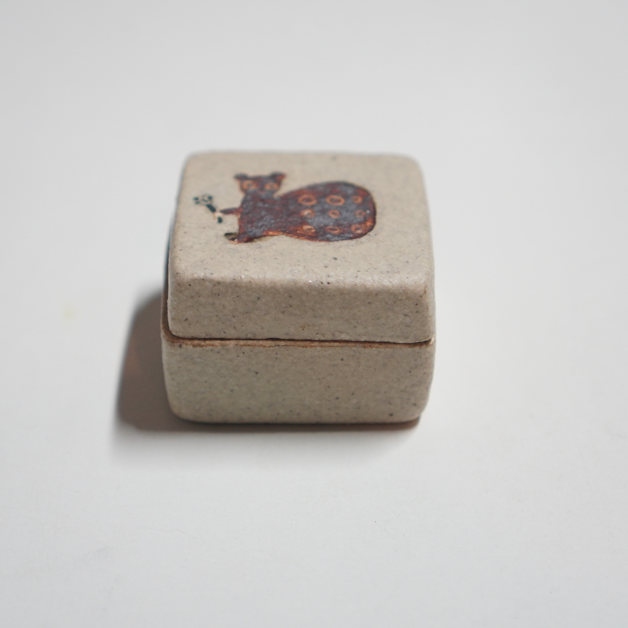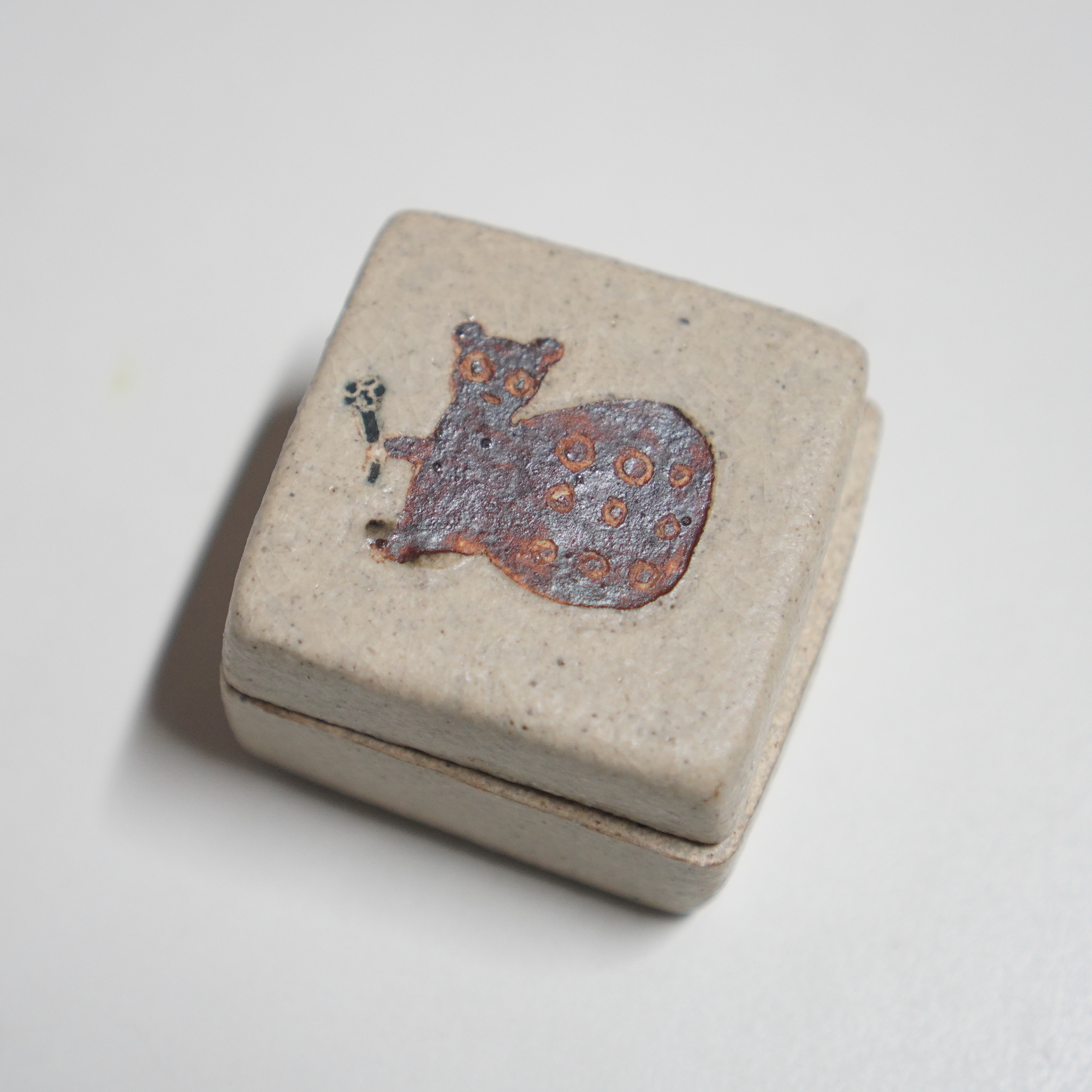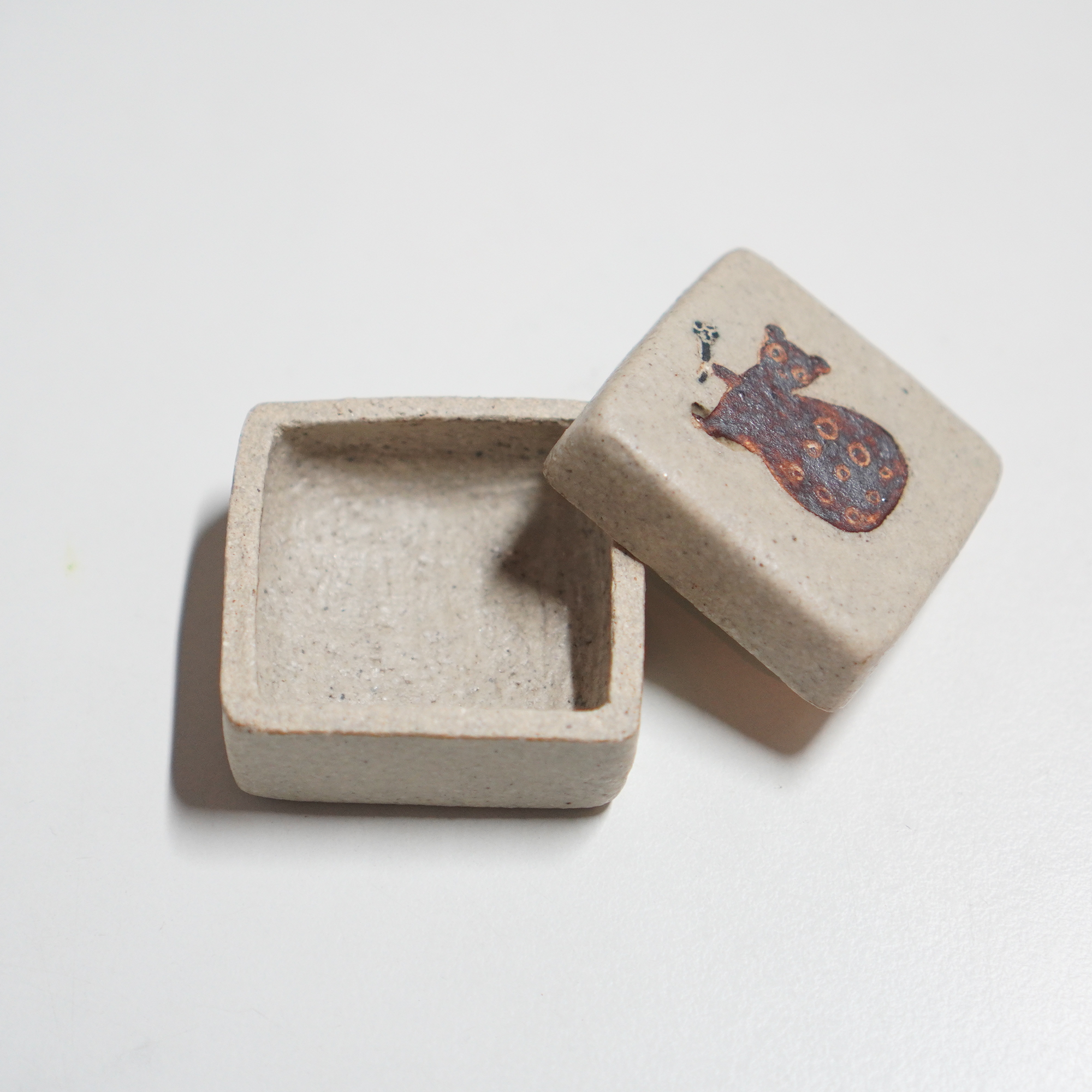なにげない日常にひっそりと寄り添えるような陶器ならではのぬくもりを感じる作品。手仕事から生まれる模様の線、モチーフの表情などひとつひとつ違った風合い。土の素朴なあたたかさが、心にほっこりと癒しを与えてくれます。自然と触れたり、本を読んだり音楽を聴いたり、、、毎日の暮らしの中から生まれたアイディアをカタチにして日々、制作されています。ワクワクした気持ちでまた開けたくなる、お気に入りの小箱が見つかりますように。