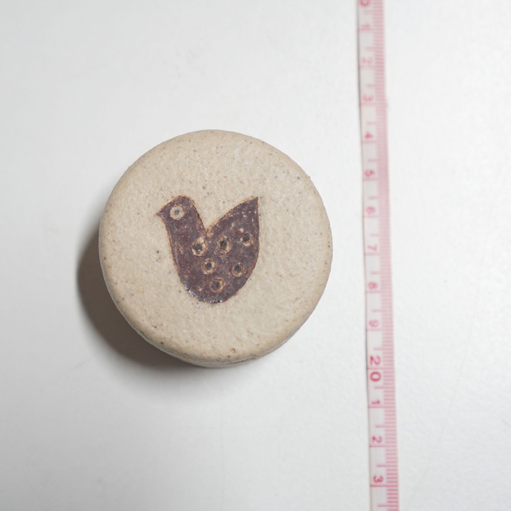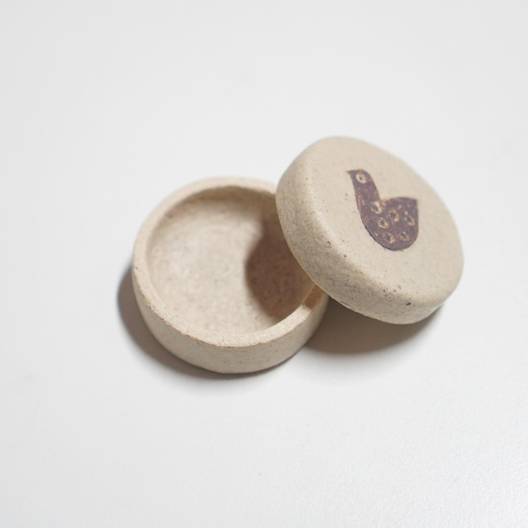 なにげない日常にひっそりと寄り添えるような陶器ならではのぬくもりを感じる作品。手仕事から生まれる模様の線、モチーフの表情などひとつひとつ違った風合い。土の素朴なあたたかさが、心にほっこりと癒しを与えてくれます。自然と触れたり、本を読んだり音楽を聴いたり、、、毎日の暮らしの中から生まれたアイディアをカタチにして日々、制作されています。ワクワクした気持ちでまた開けたくなる、お気に入りの小箱が見つかりますように。