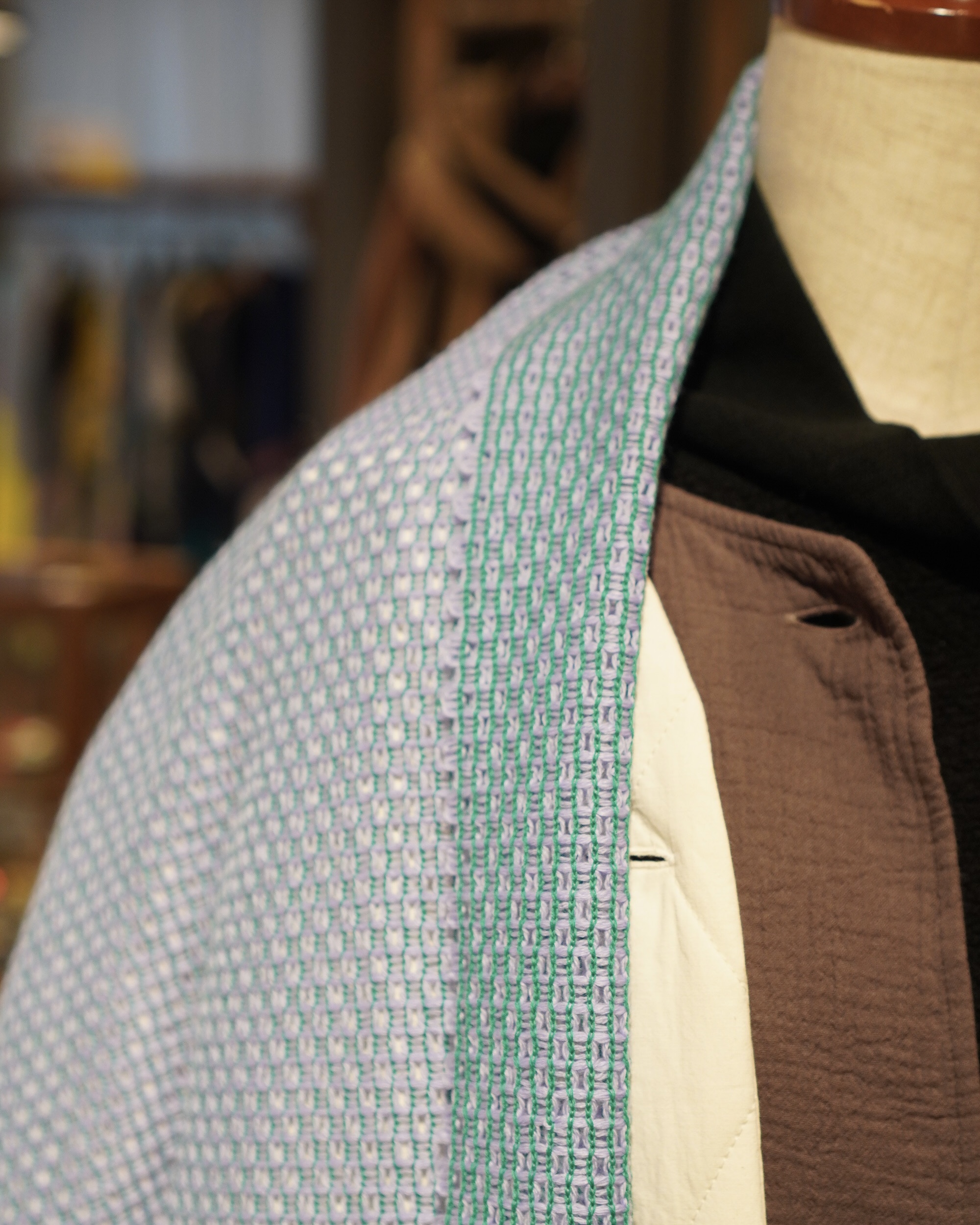 日本各地の織工場にてオリジナル生地を制作し、生地の楽しさや面白さが伝わってくるような明るい色合いと、テクスチャーが楽しい素材感のアイテム。