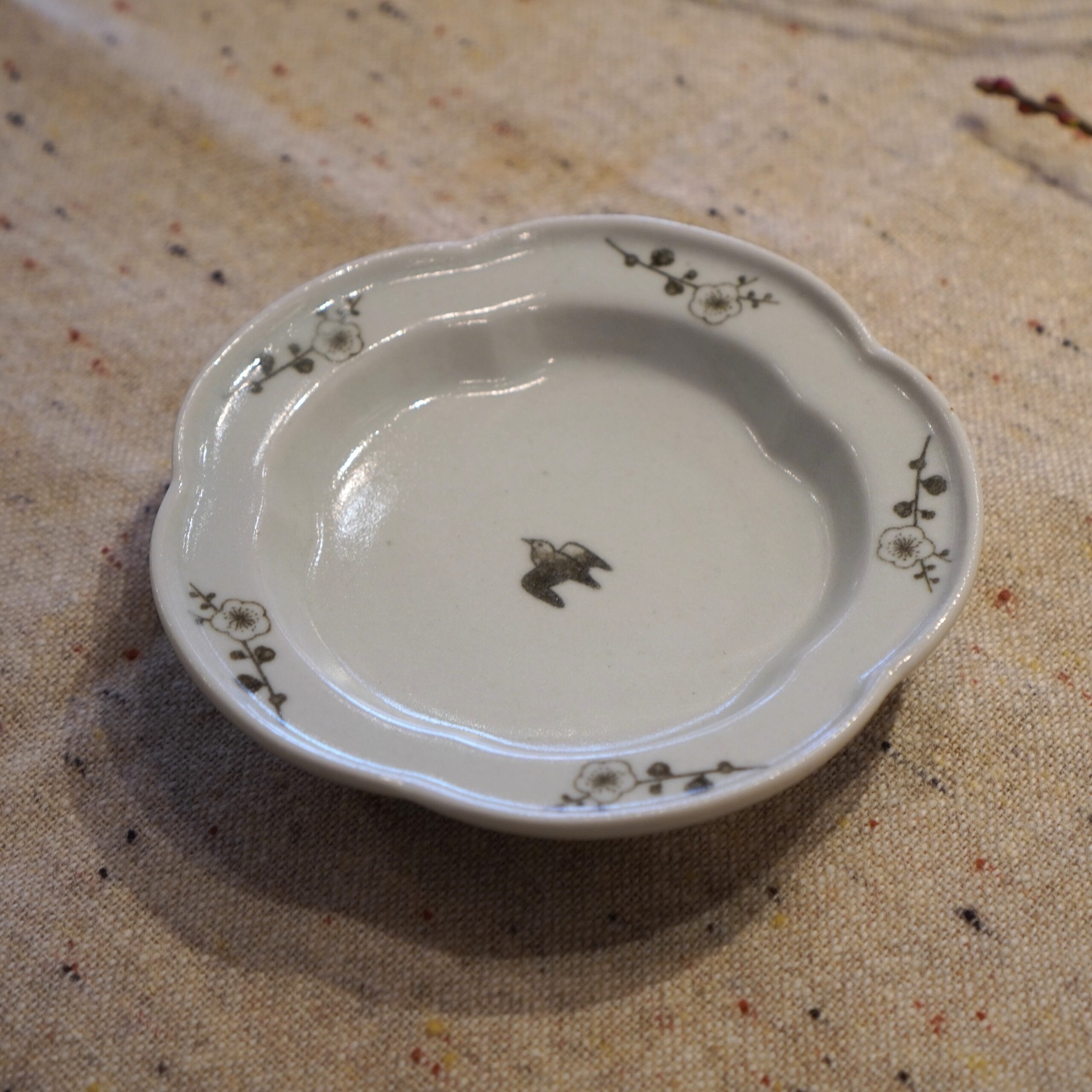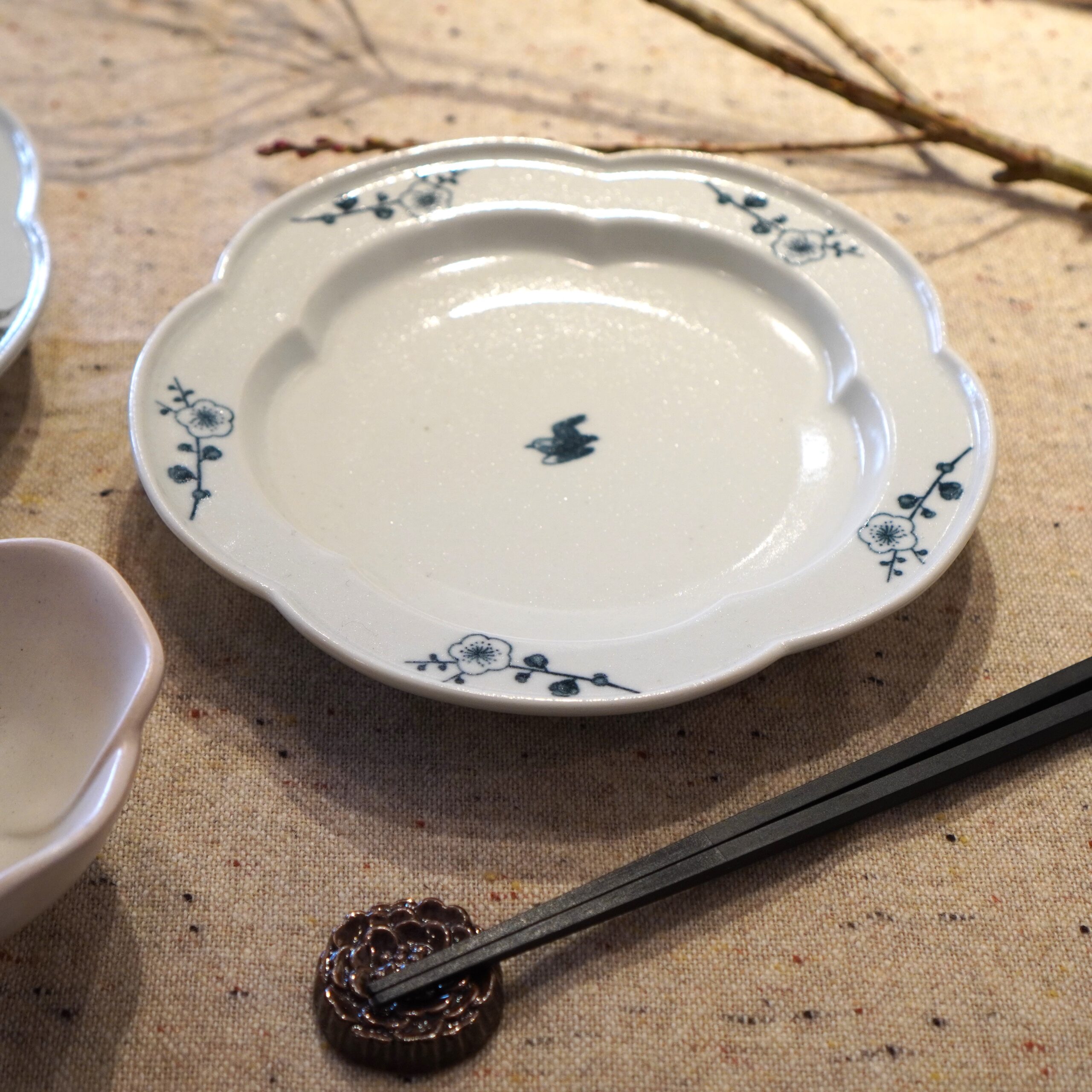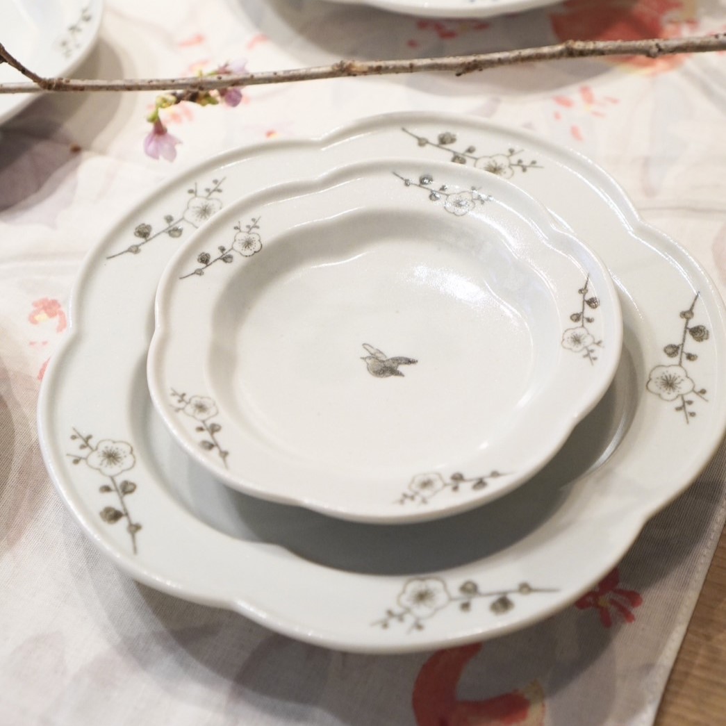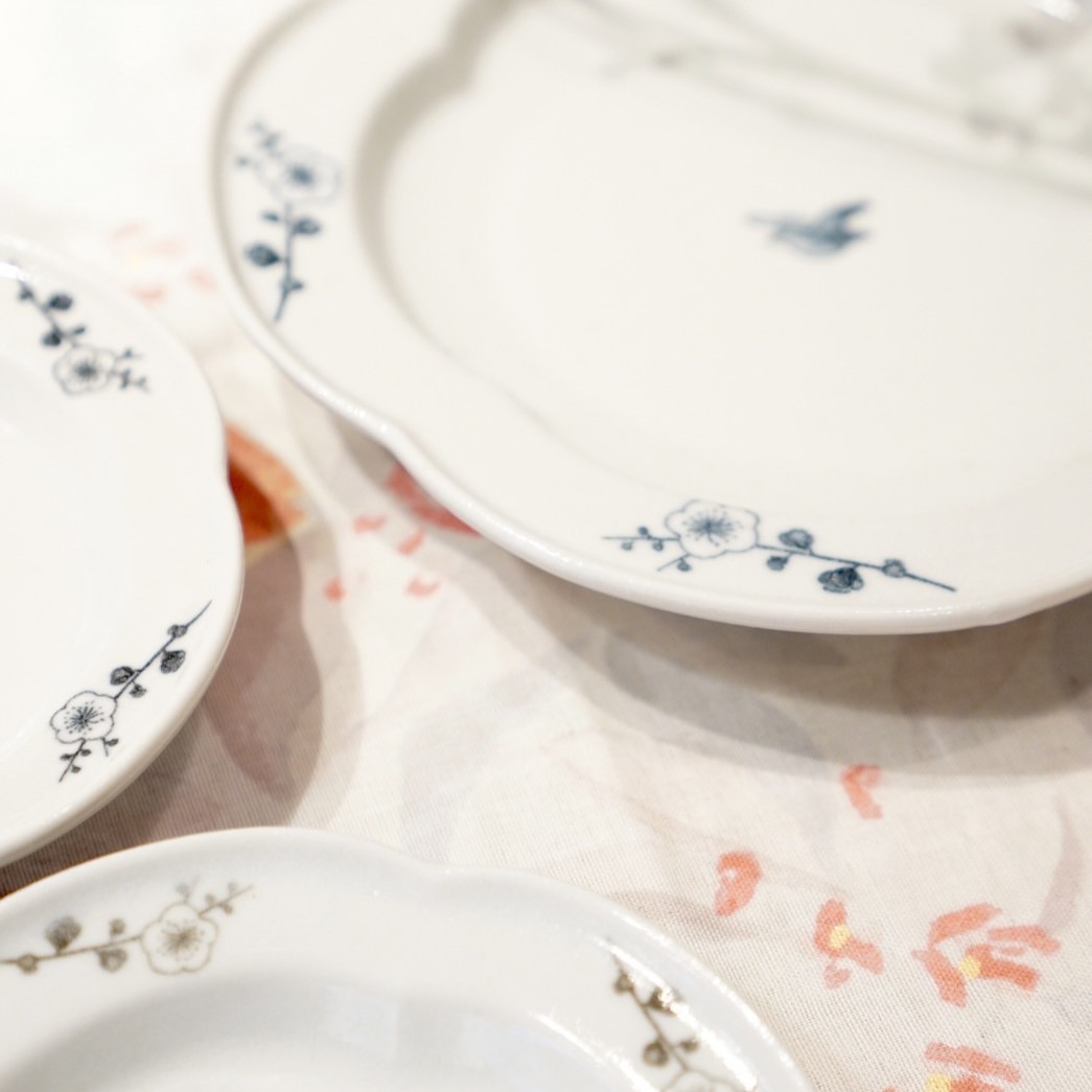 5枚の花びらをかたどった梅花の形状は華やかかつ凛とした気持ちに。高台もあり特別感やおもてなし感も演出してくれる一品です。まだ旧暦で新年を祝っていた時代、新年を迎える時期は梅の花の開花時期。雪が降り積もる寒さの中、新年を祝うように咲く梅の花は大変縁起が良いものとされています。そんな早春に花咲く梅の花と開花を喜ぶ鶯をモチーフにしたシリーズ。古典的でもあり、現代的でもあるため和食だけでなく、中華料理との相性も◎盛り付ける料理でいろいろな表情をお楽しみいただけます。