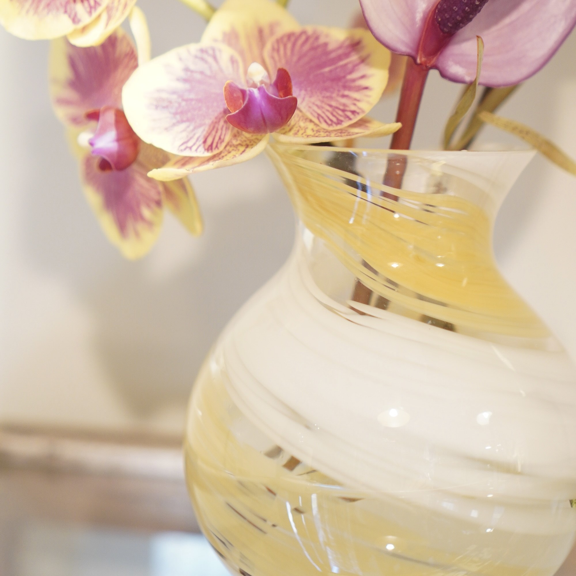 日本の情景や青森県の四季の移り替わりを表現した「津軽びいどろ」。水彩のようなふんわり優しい色合い、花びらに水がしたたる“しずく”のように瑞々しい小ぶりで可愛らしいフラワーベースです。季節に合わせて花を飾ったりブーケをそのまますっぽり生けられ、テーブルに置くだけで華やかさを演出してくれます。