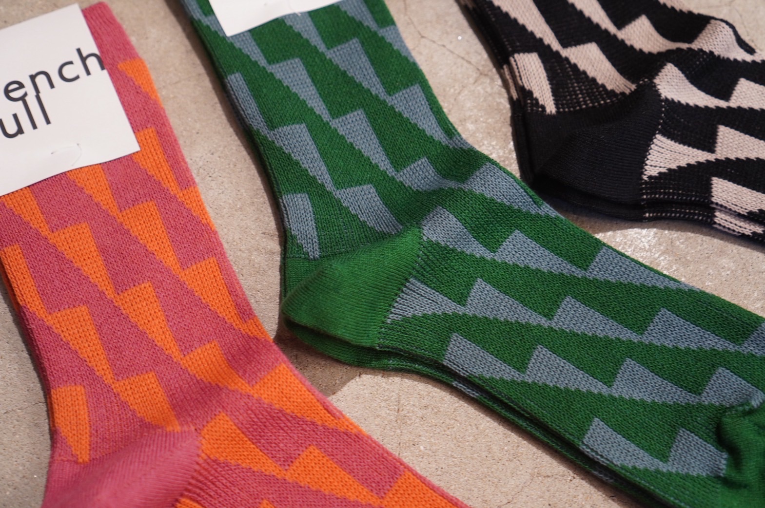 山並みのような三角が連なった幾何学模様のジャガード編みで程よい厚みのソックスです。シンプルながらインパクトのある配色がアクセントになる1足です。