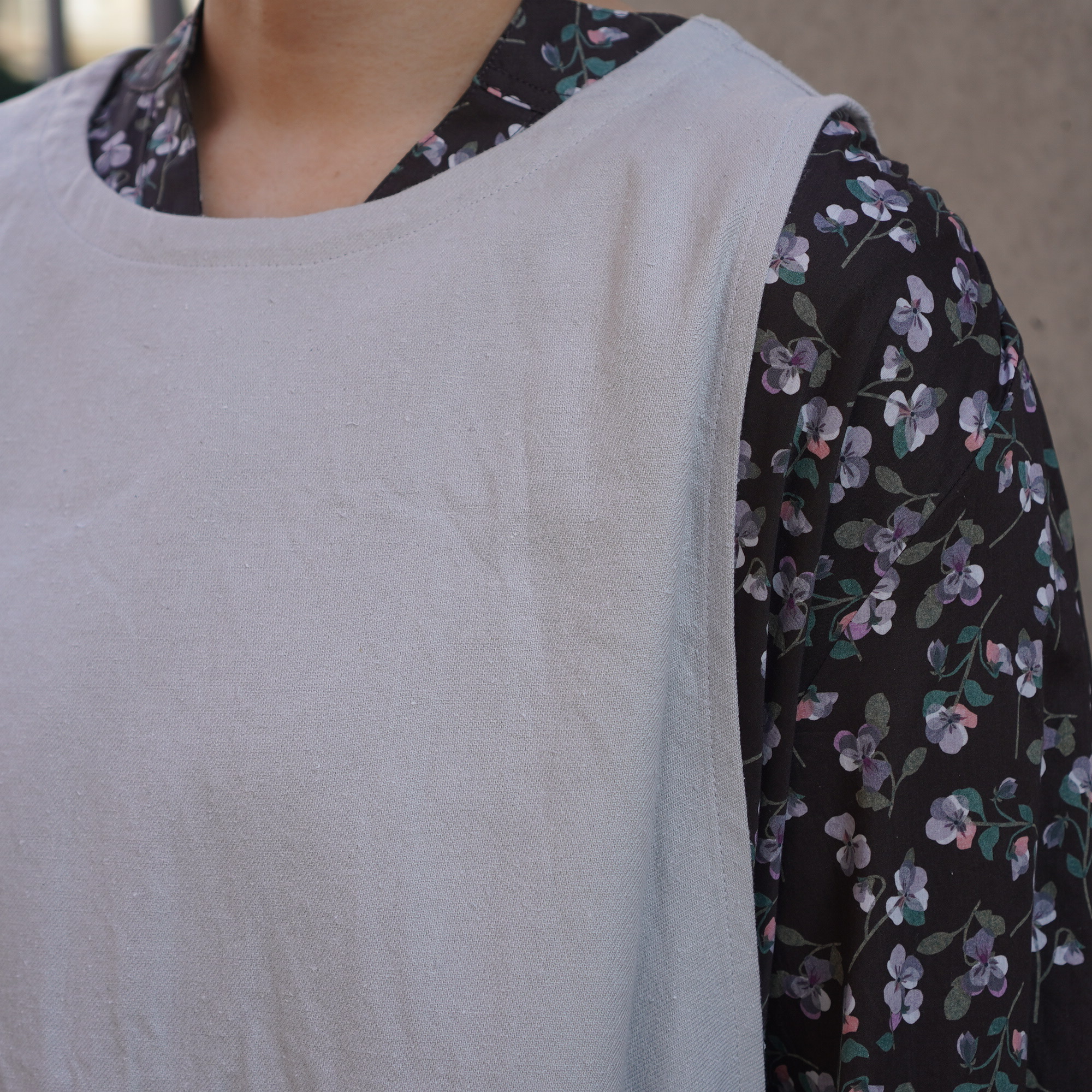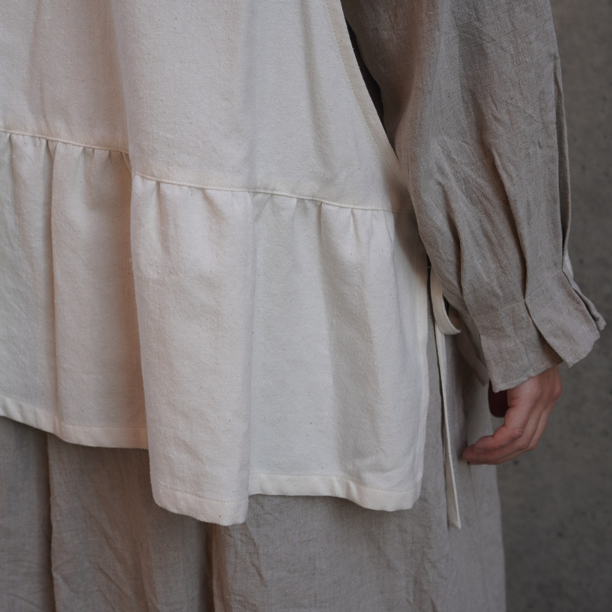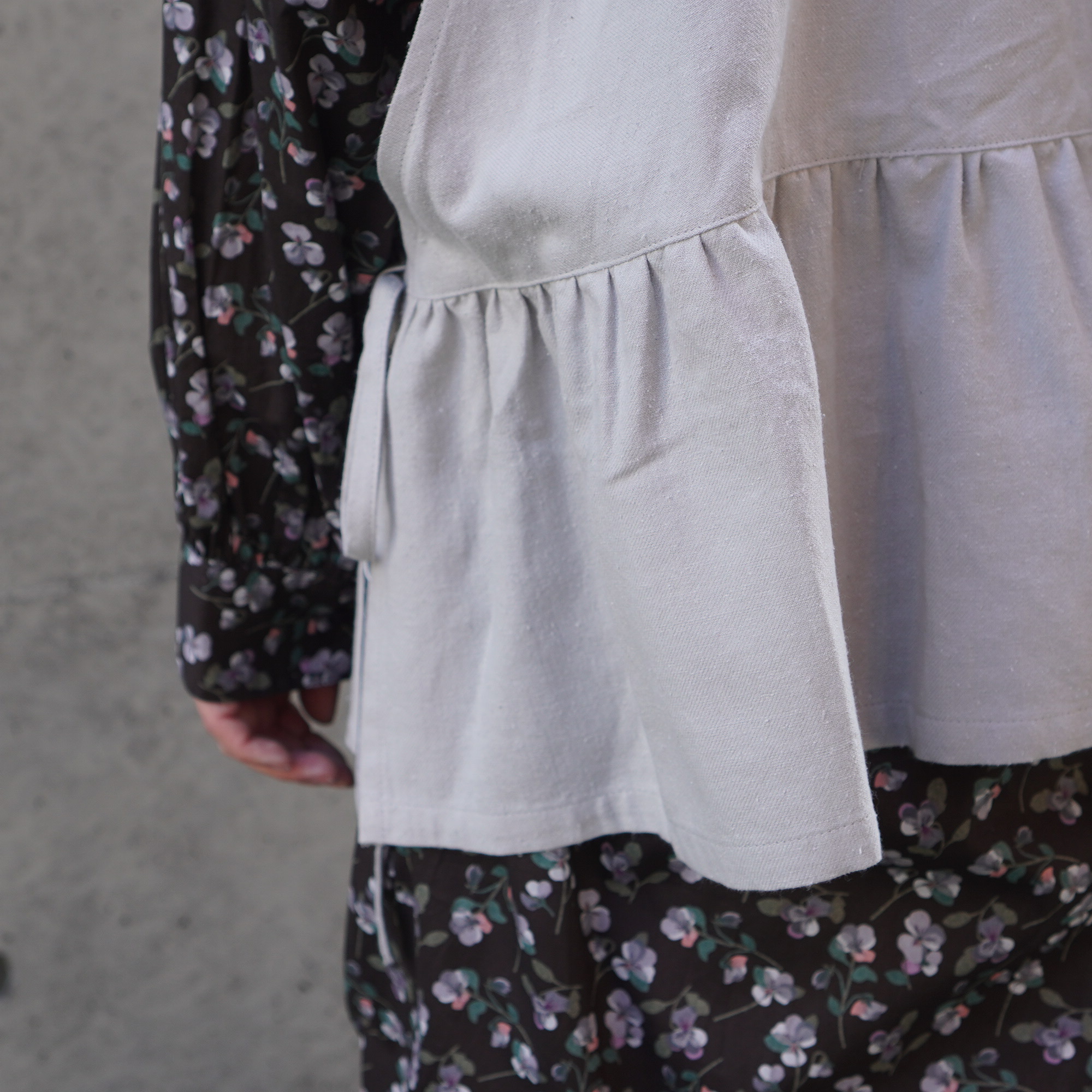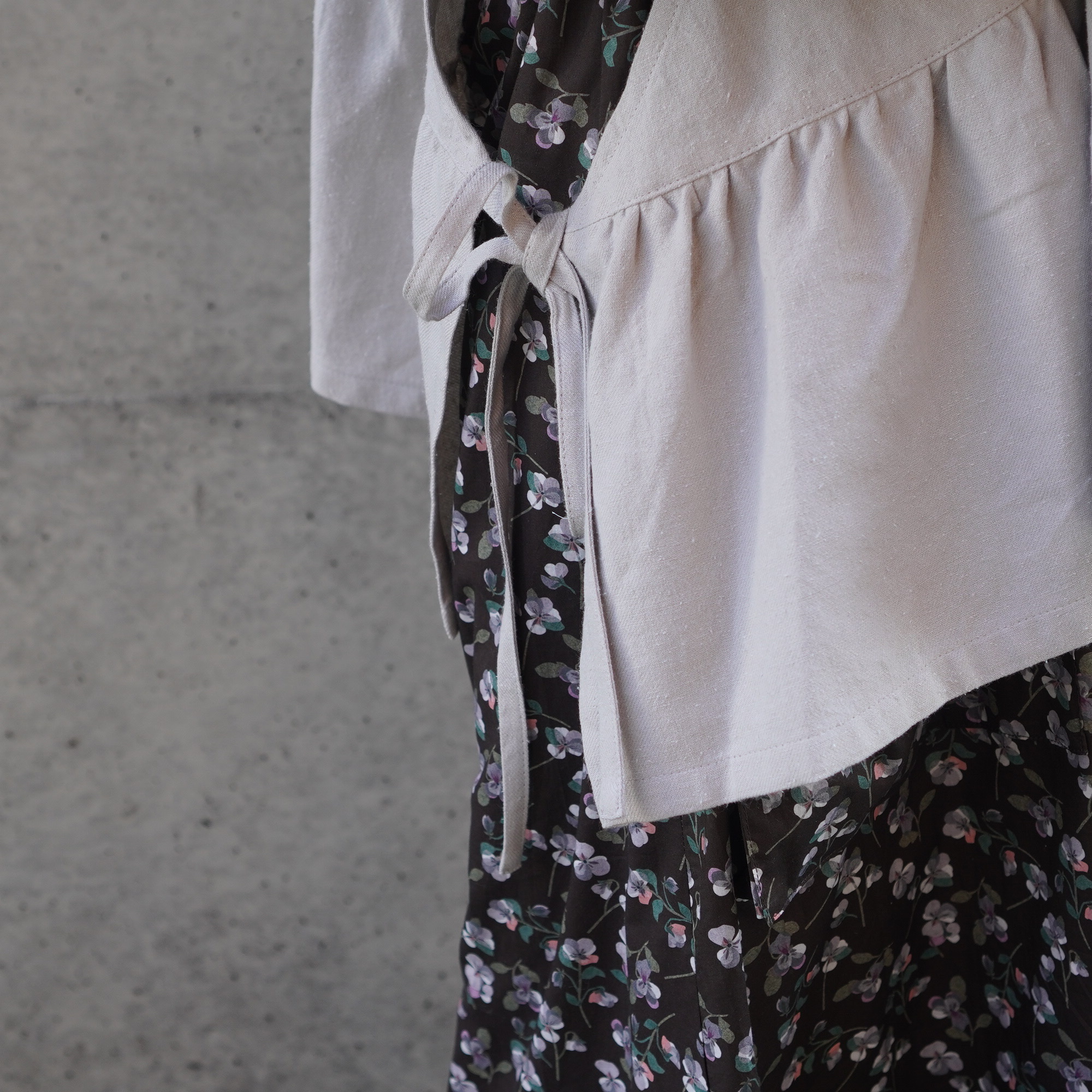 シルク混のしっとりとした柔らかな肌触りに、独特の凹凸感とシルクネップによる表面感が特徴のベストです。サイドで紐を結んでざっくりと被るだけでスタイリングが華やかに♩ウエスト切替えでギャザーが程よい甘さを演出してくれます。ゆったりとしたシルエットなので、ワンピースなど様々なお洋服と合わせてレイヤードスタイルをお楽しみ頂けます。