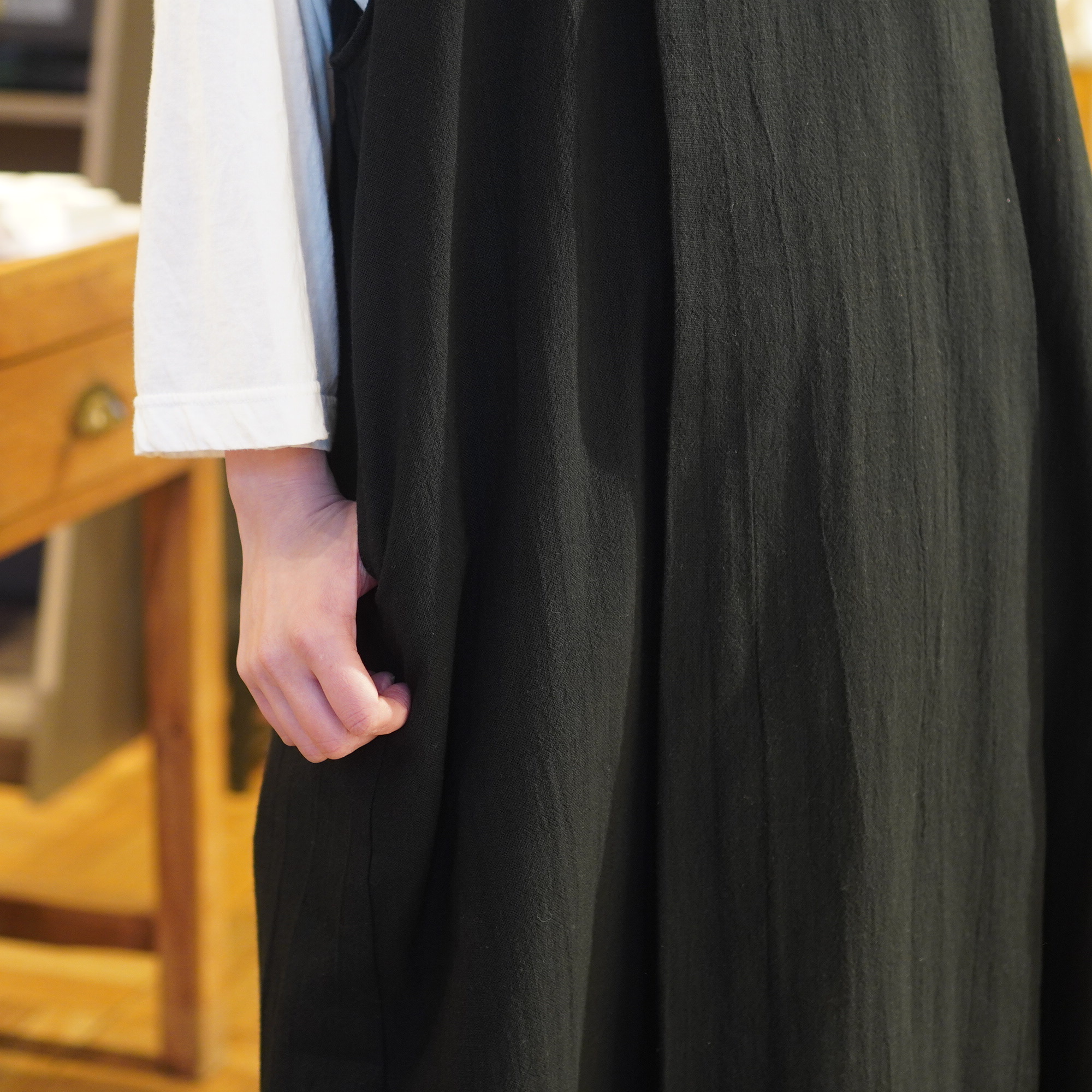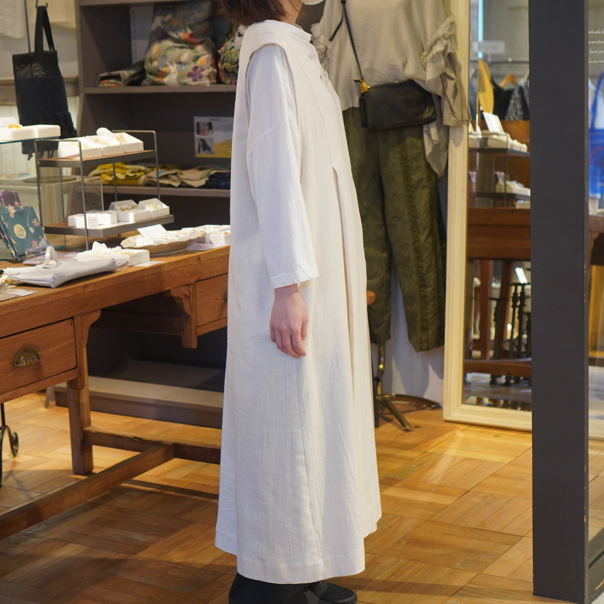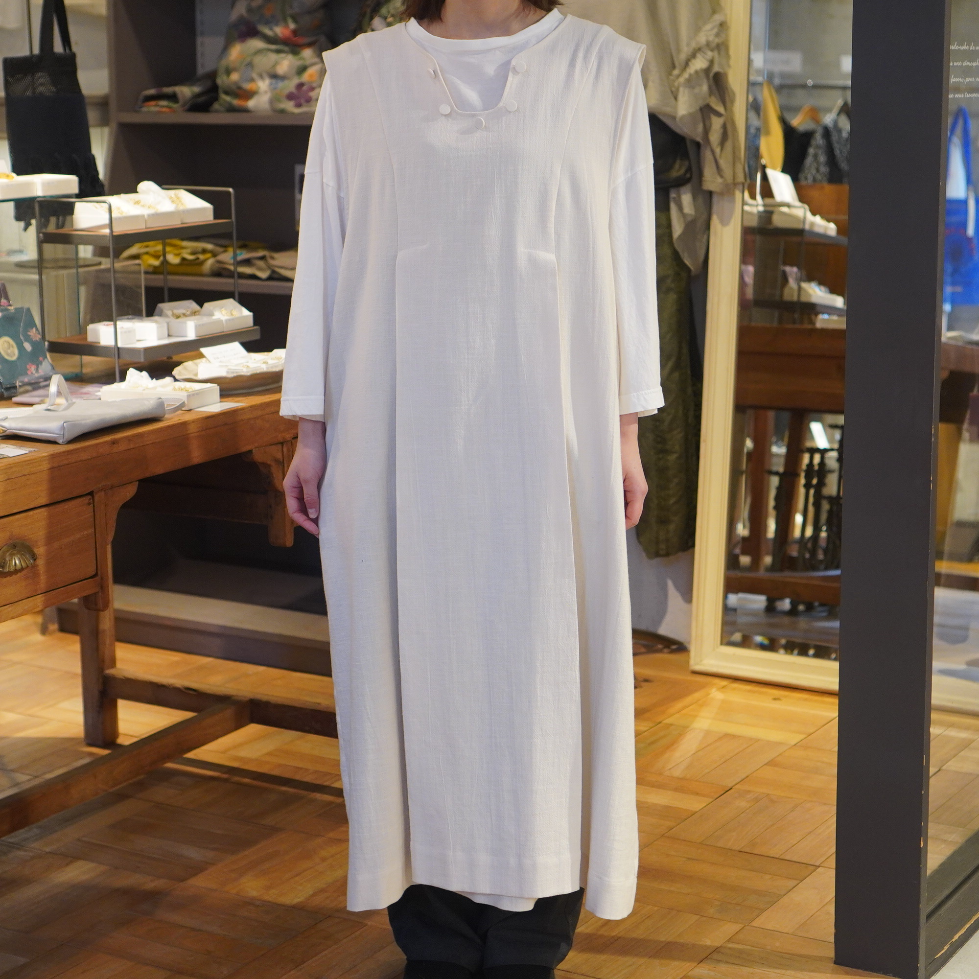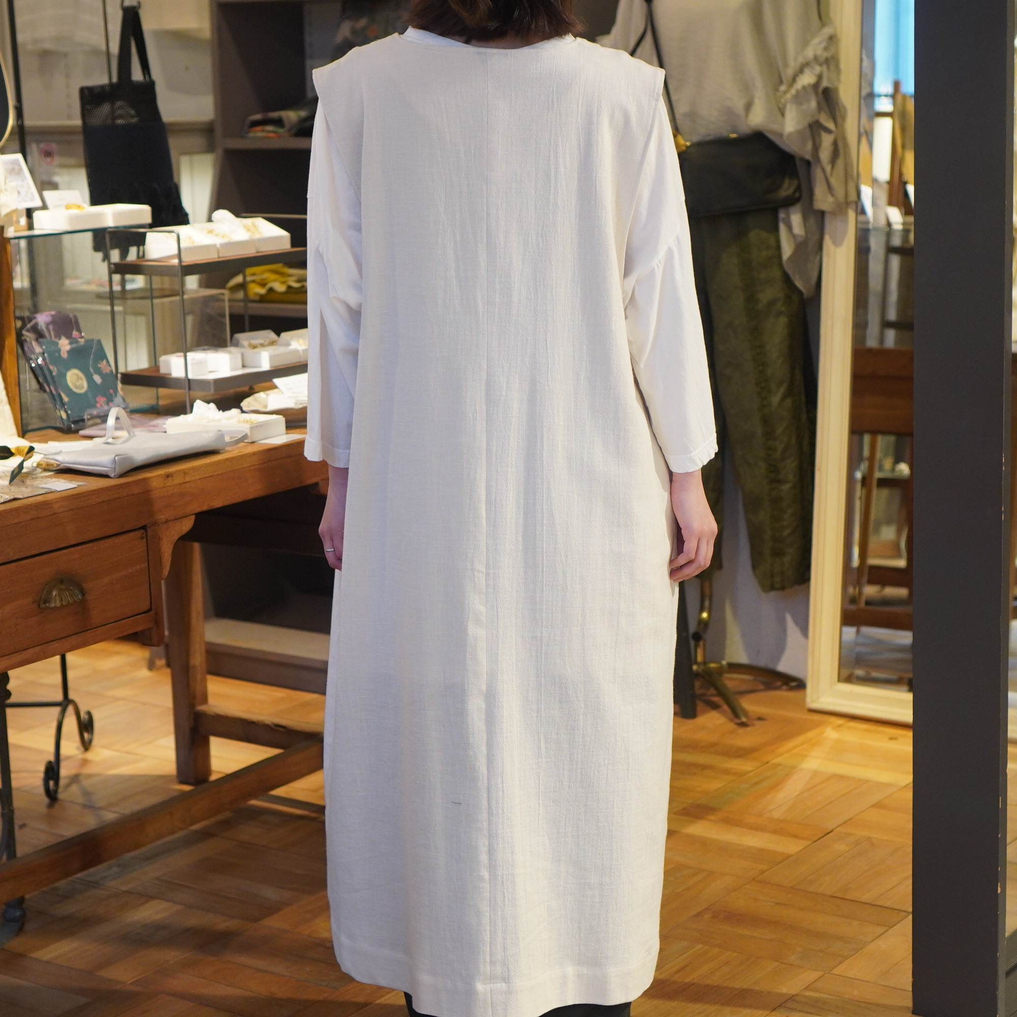 平面的な民族衣装を元に、ギャザーやタック、様々な長方形のパターンを組み合わせて作られており、着用することで生まれるシルエットが美しい1枚。ムラ糸でざっくりと織り上げた生地に、ダブルワッシャー加工を施した素材は、加工によって生まれるふくらみと柔らかさが特徴。洗いざらしのような自然な風合いが着るほどに肌になじむ、心地よい質感が魅力の一枚です。