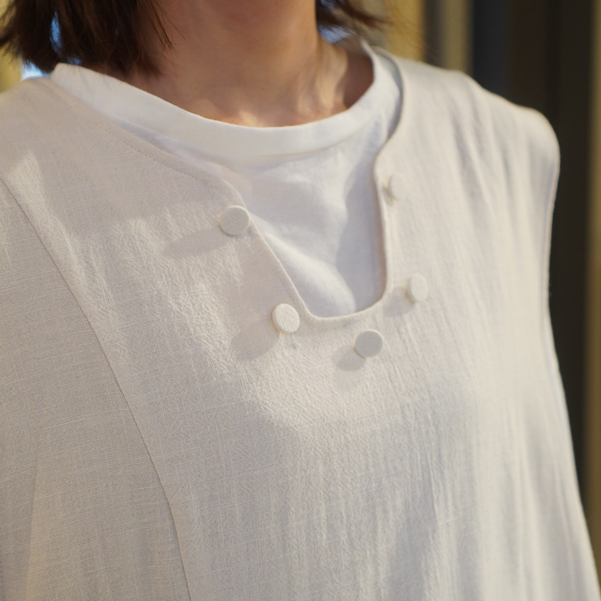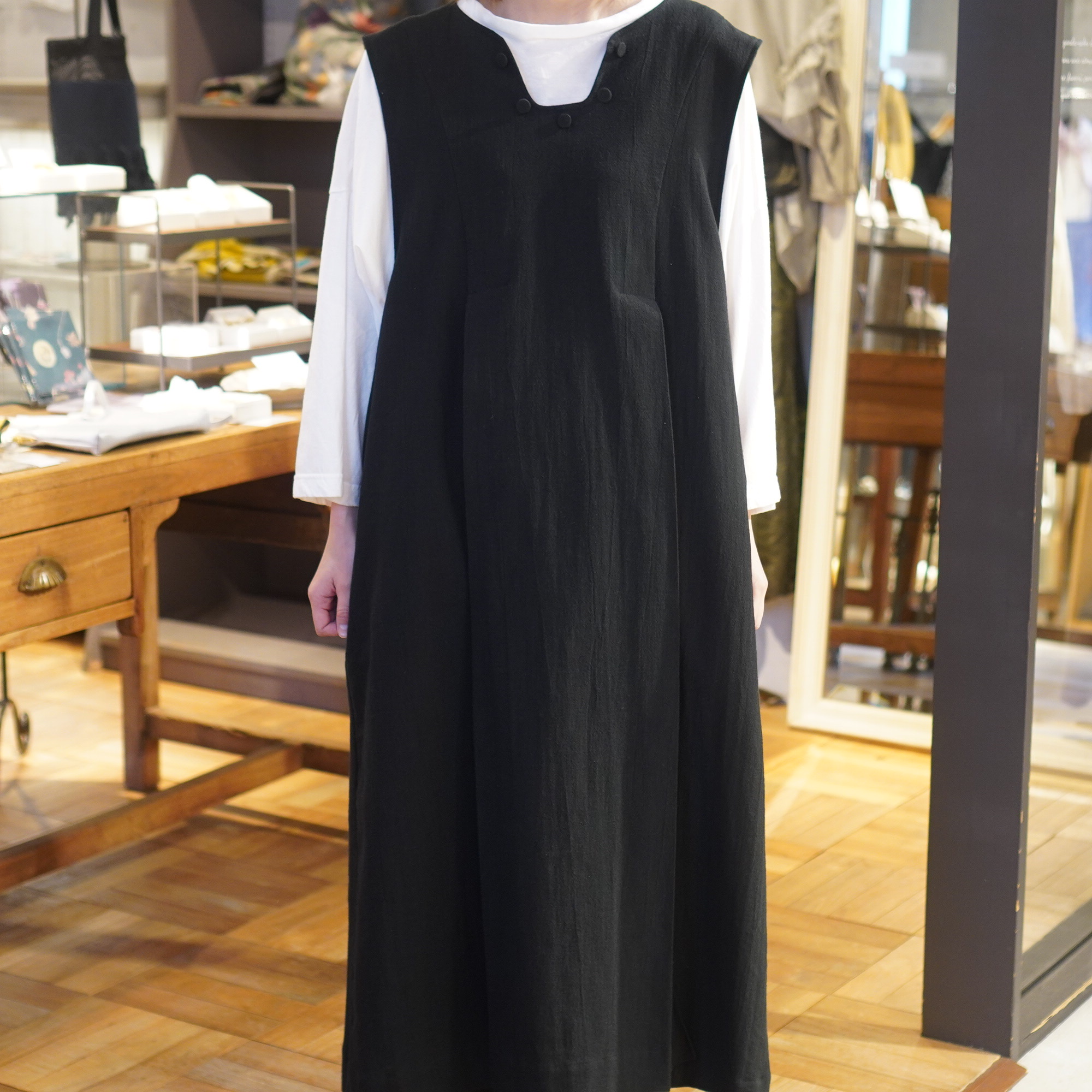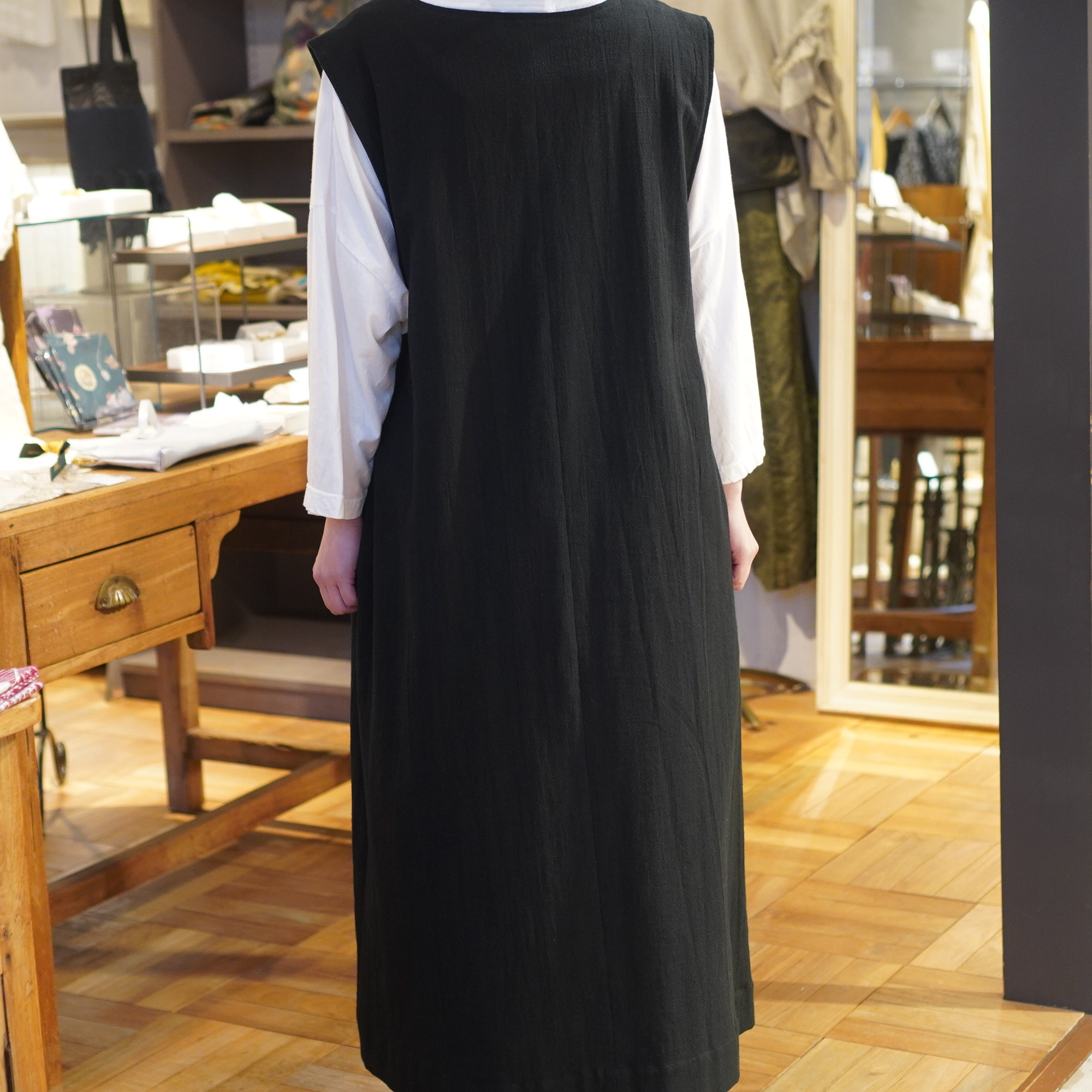 平面的な民族衣装を元に、ギャザーやタック、様々な長方形のパターンを組み合わせて作られており、着用することで生まれるシルエットが美しい1枚。ムラ糸でざっくりと織り上げた生地に、ダブルワッシャー加工を施した素材は、加工によって生まれるふくらみと柔らかさが特徴。洗いざらしのような自然な風合いが着るほどに肌になじむ、心地よい質感が魅力の一枚です。