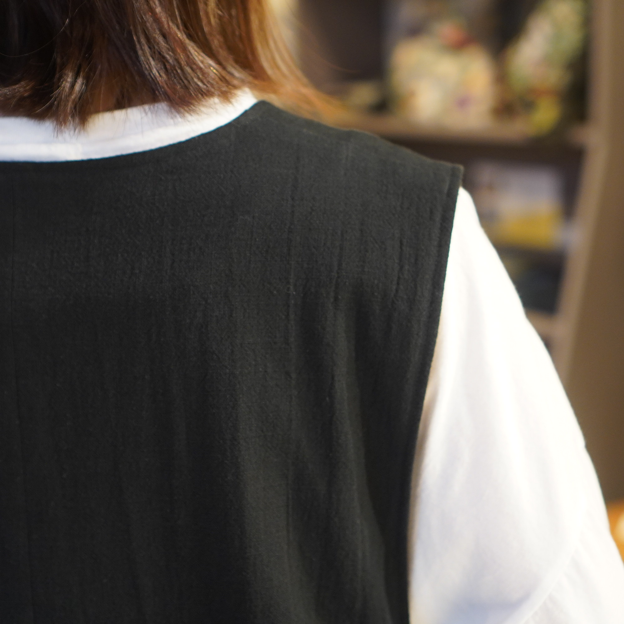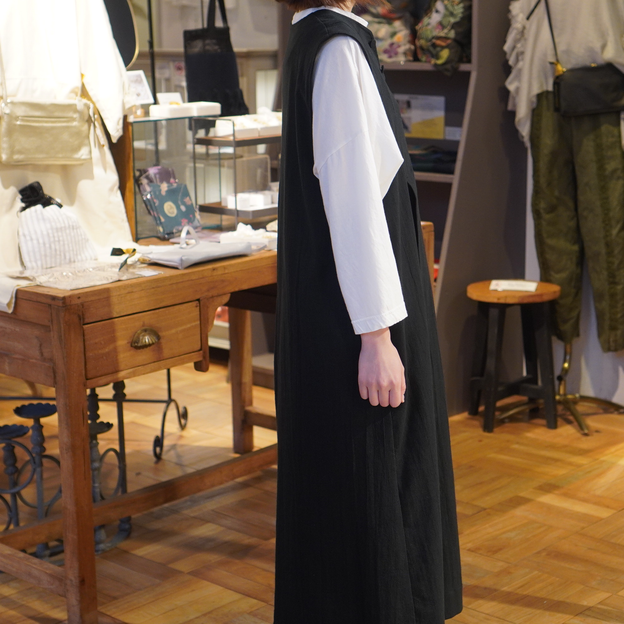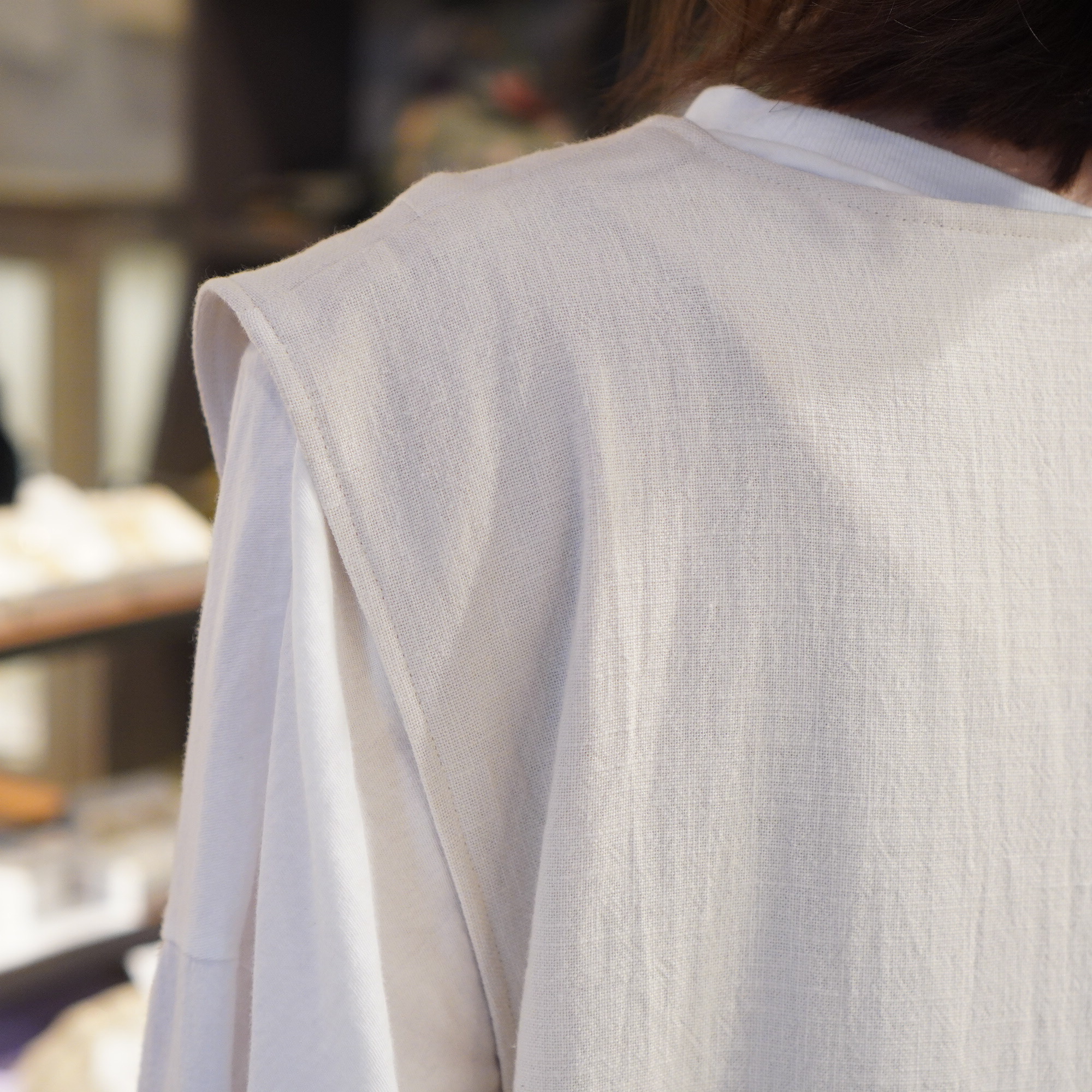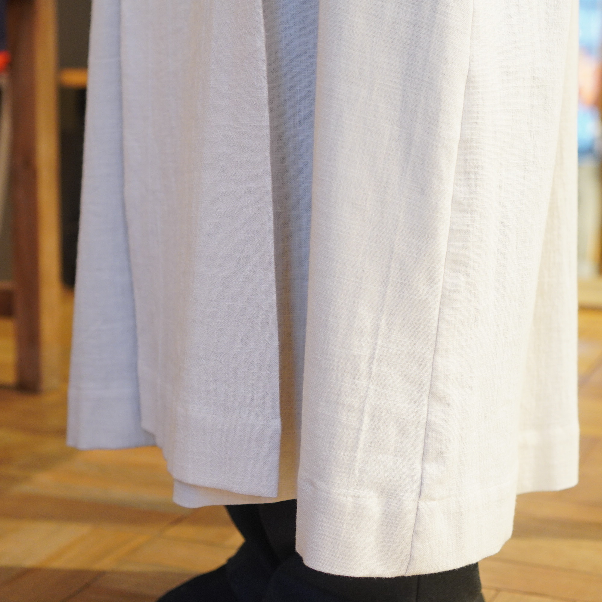 平面的な民族衣装を元に、ギャザーやタック、様々な長方形のパターンを組み合わせて作られており、着用することで生まれるシルエットが美しい1枚。ムラ糸でざっくりと織り上げた生地に、ダブルワッシャー加工を施した素材は、加工によって生まれるふくらみと柔らかさが特徴。洗いざらしのような自然な風合いが着るほどに肌になじむ、心地よい質感が魅力の一枚です。