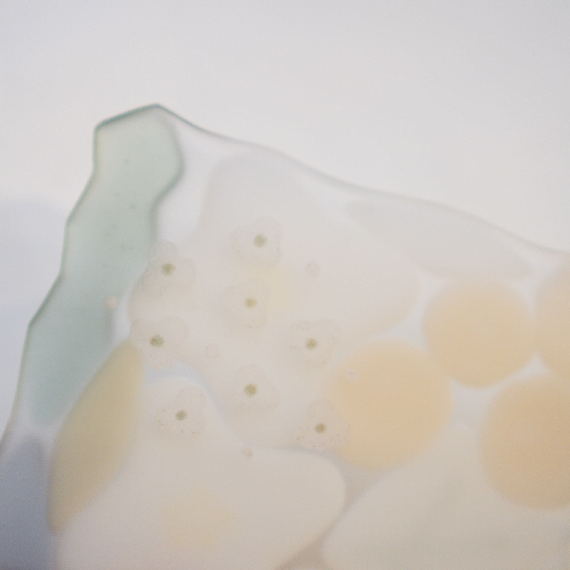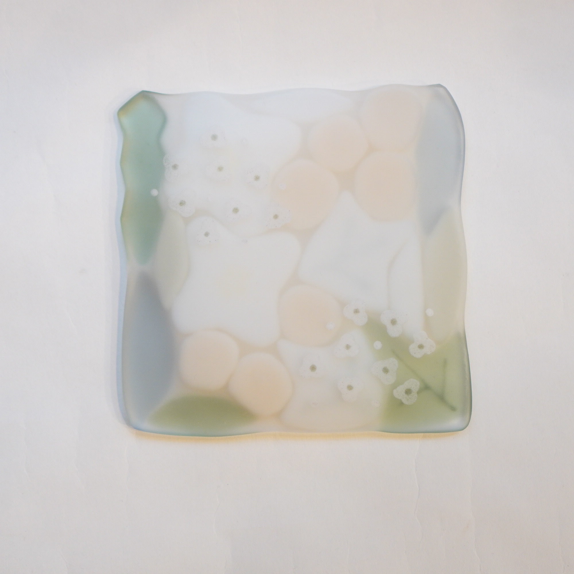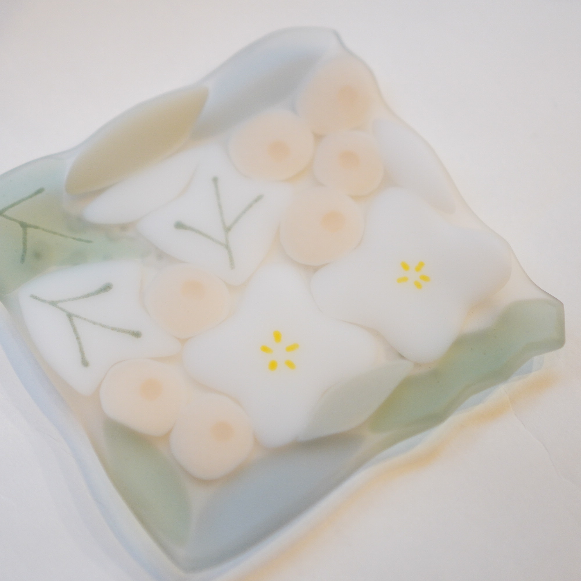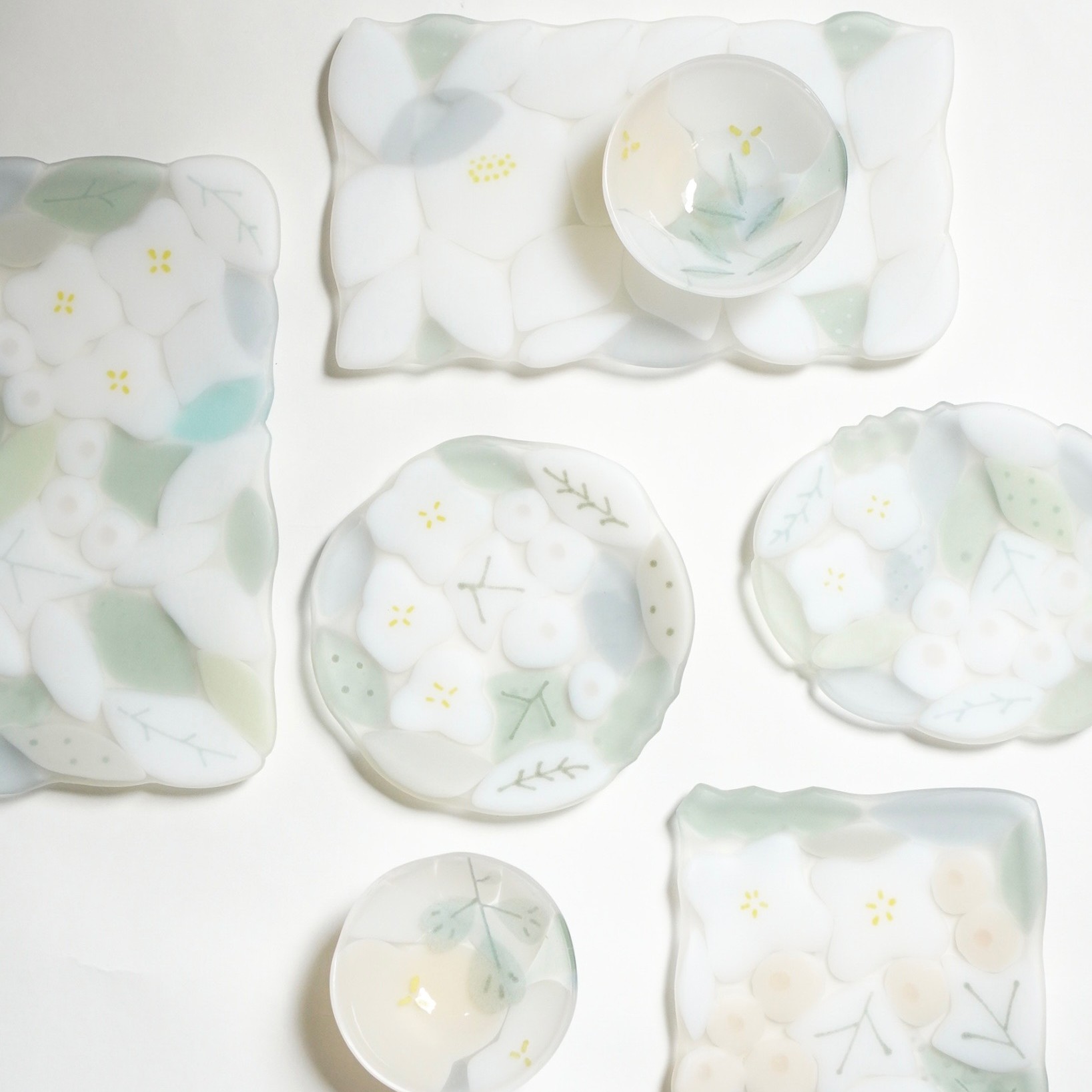 日々の暮らしが彩り、楽しく過ごせますように…と想いが込められた作品。板ガラスを重ね、焼き、かたちづくる“フュージング”や“スランピング”といった技法を用いて、やわらかな草花がそっと息づいているかのような作品を日々、制作されています。手書きで施された繊細な絵付けは手仕事ならではの、やさしい雰囲気を纏い、ふと心を和らげてくれます。