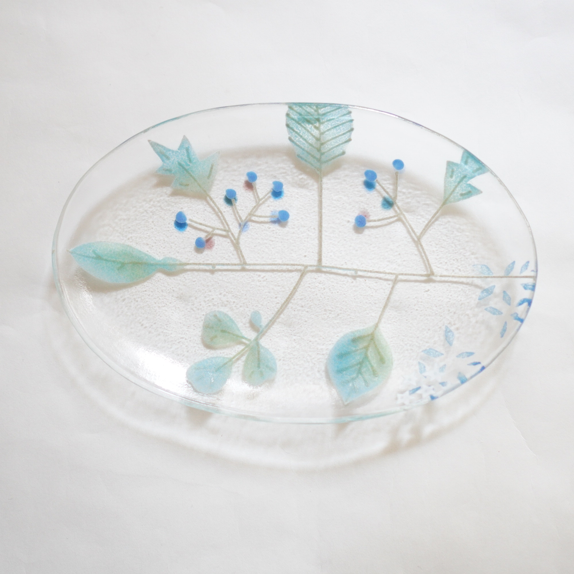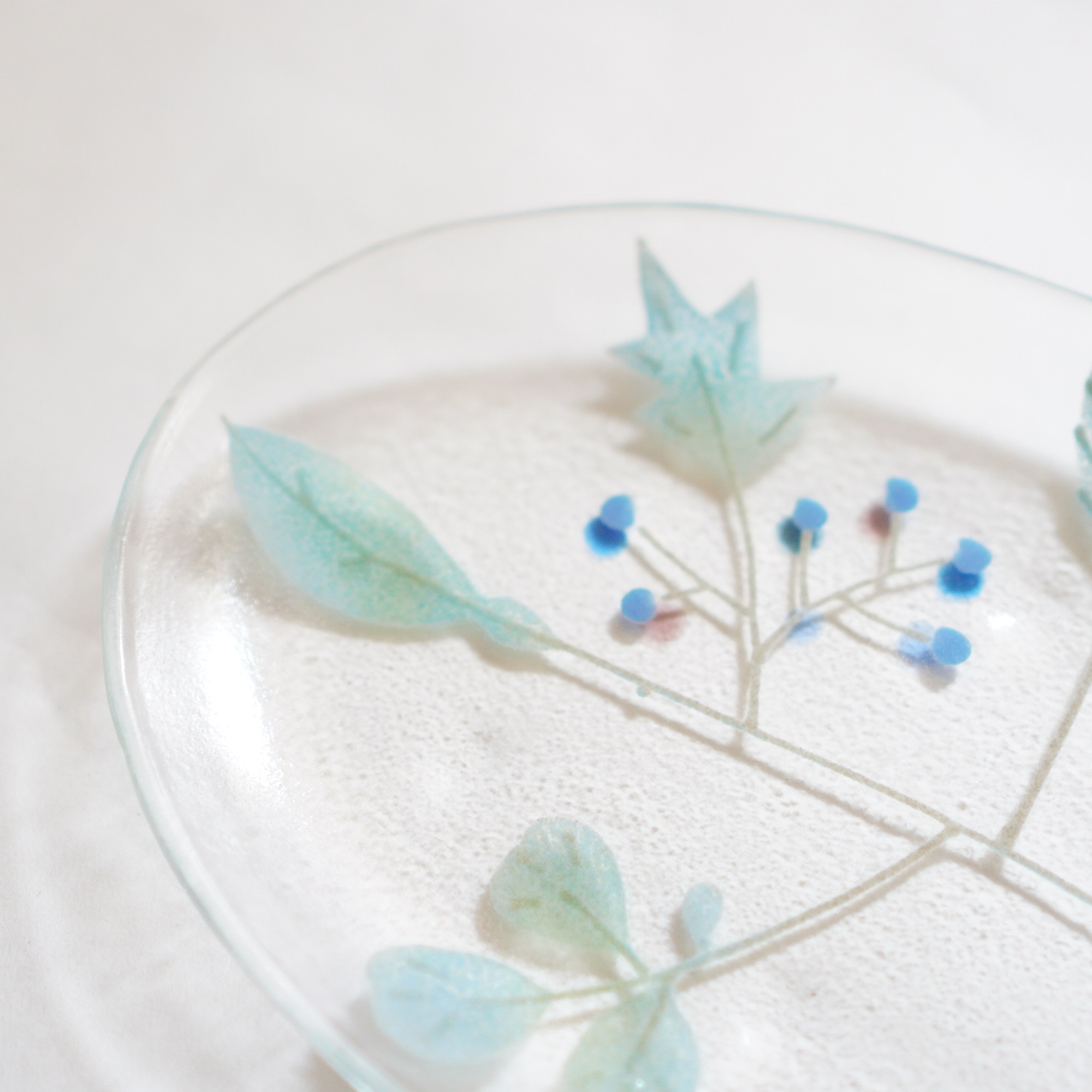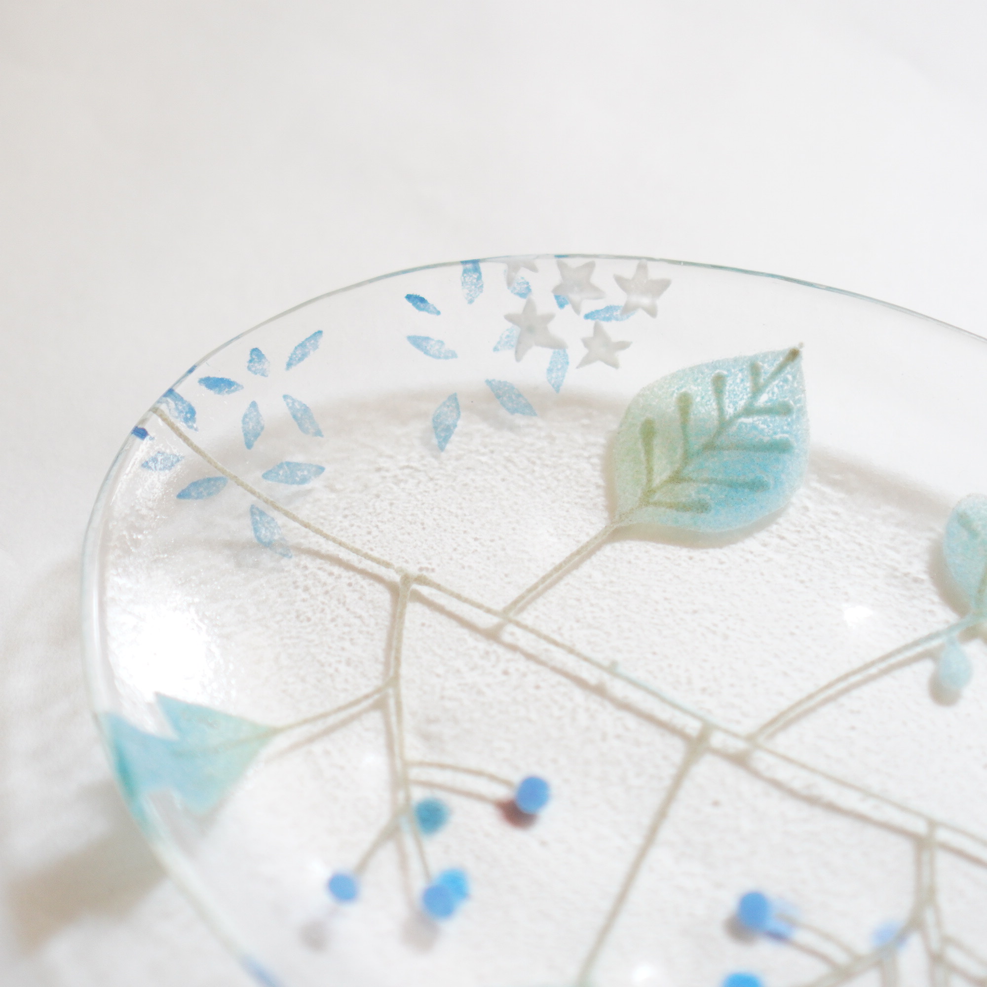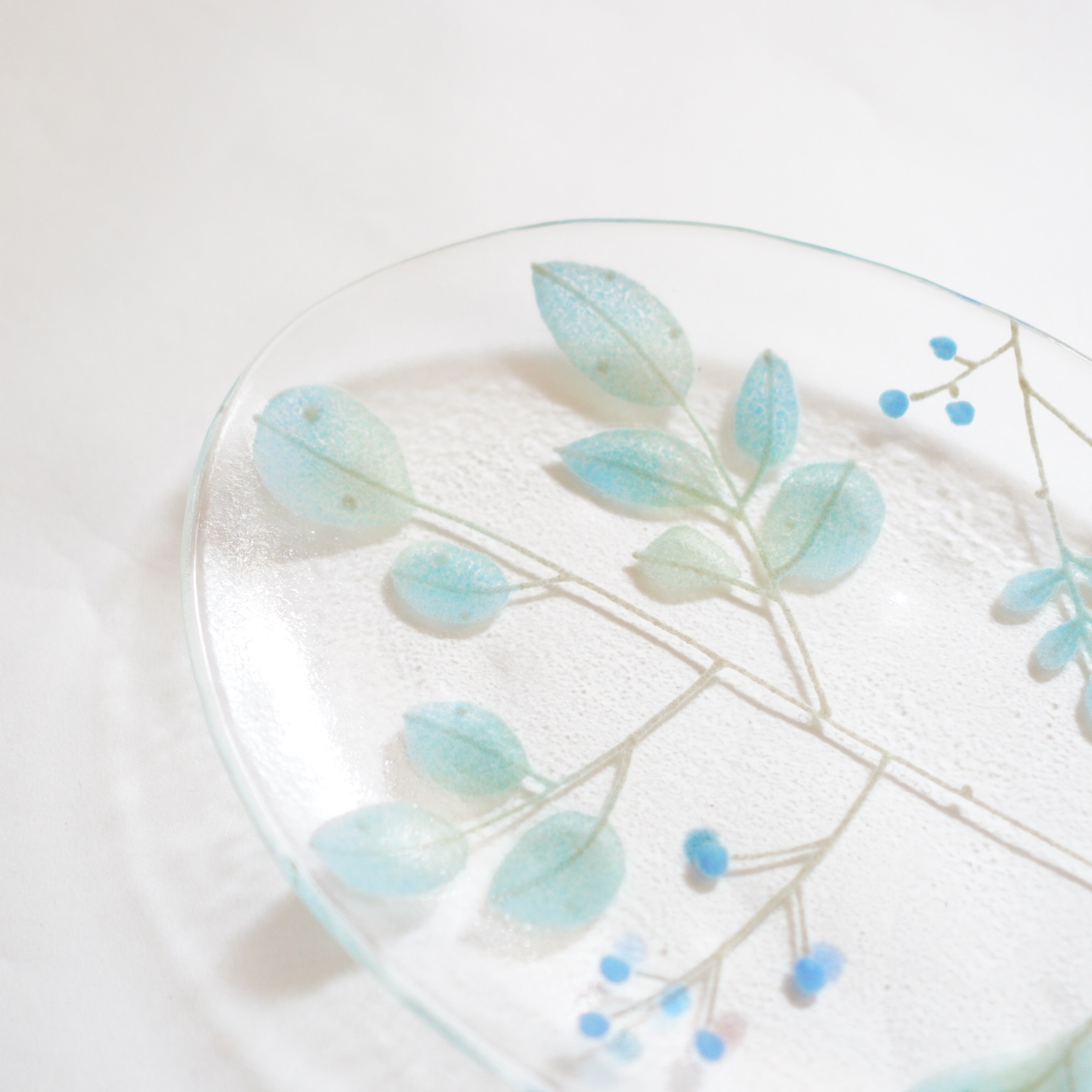 日々の暮らしが彩り、楽しく過ごせますように…と想いが込められた作品。板ガラスを重ね、焼き、かたちづくる“フュージング”や“スランピング”といった技法を用いて、やわらかな草花がそっと息づいているかのような作品を日々、制作されています。手書きで施された繊細な絵付けは手仕事ならではの、やさしい雰囲気を纏い、ふと心を和らげてくれます。