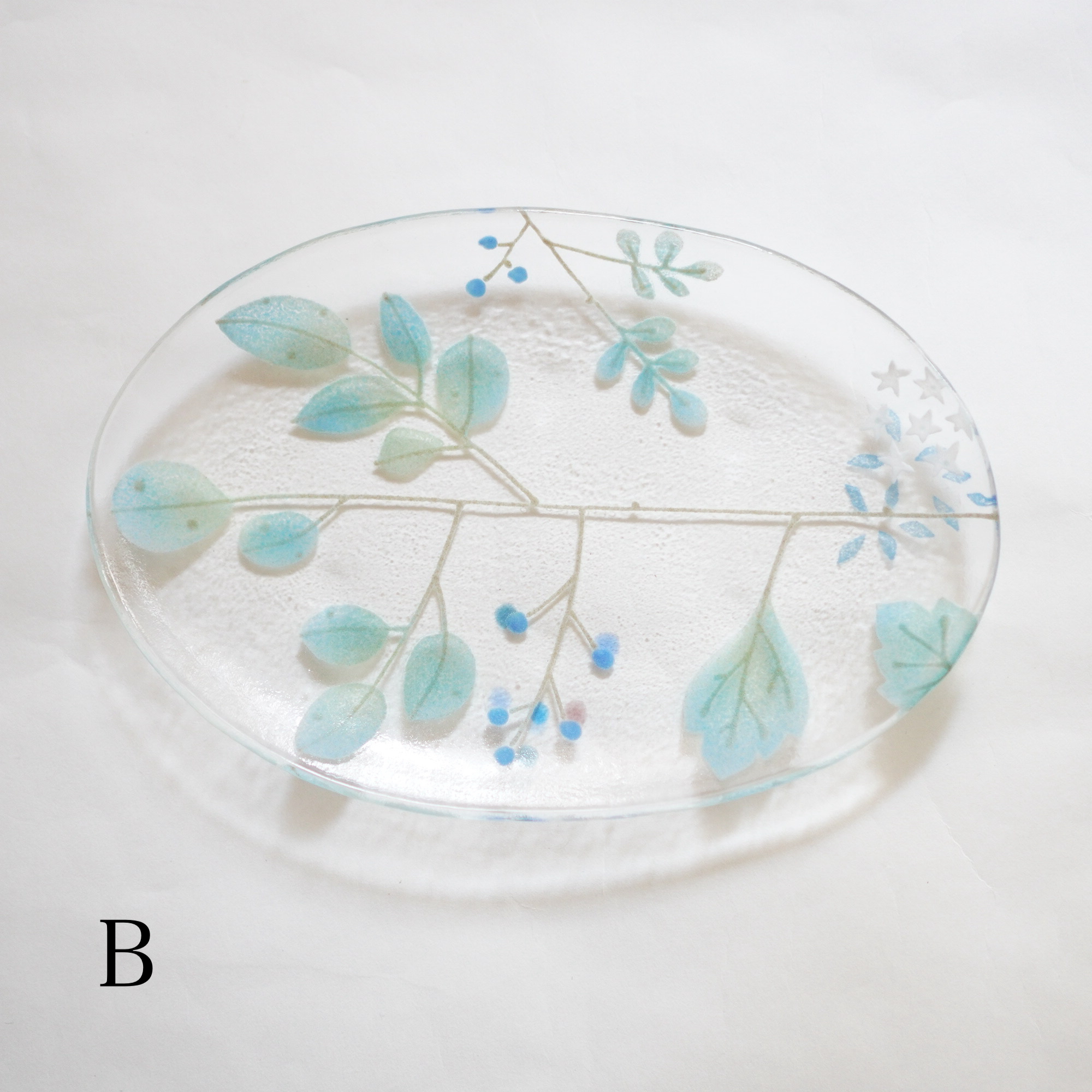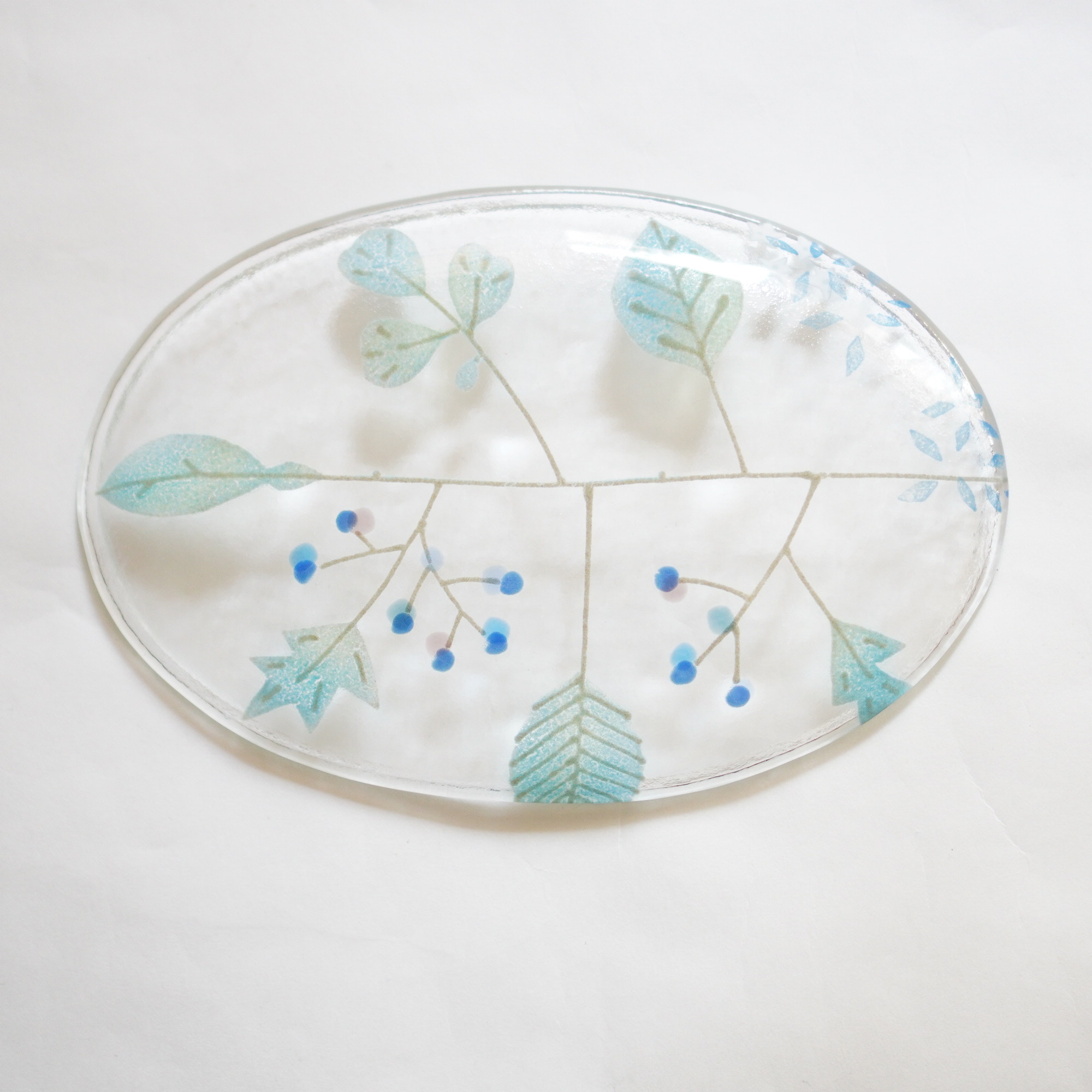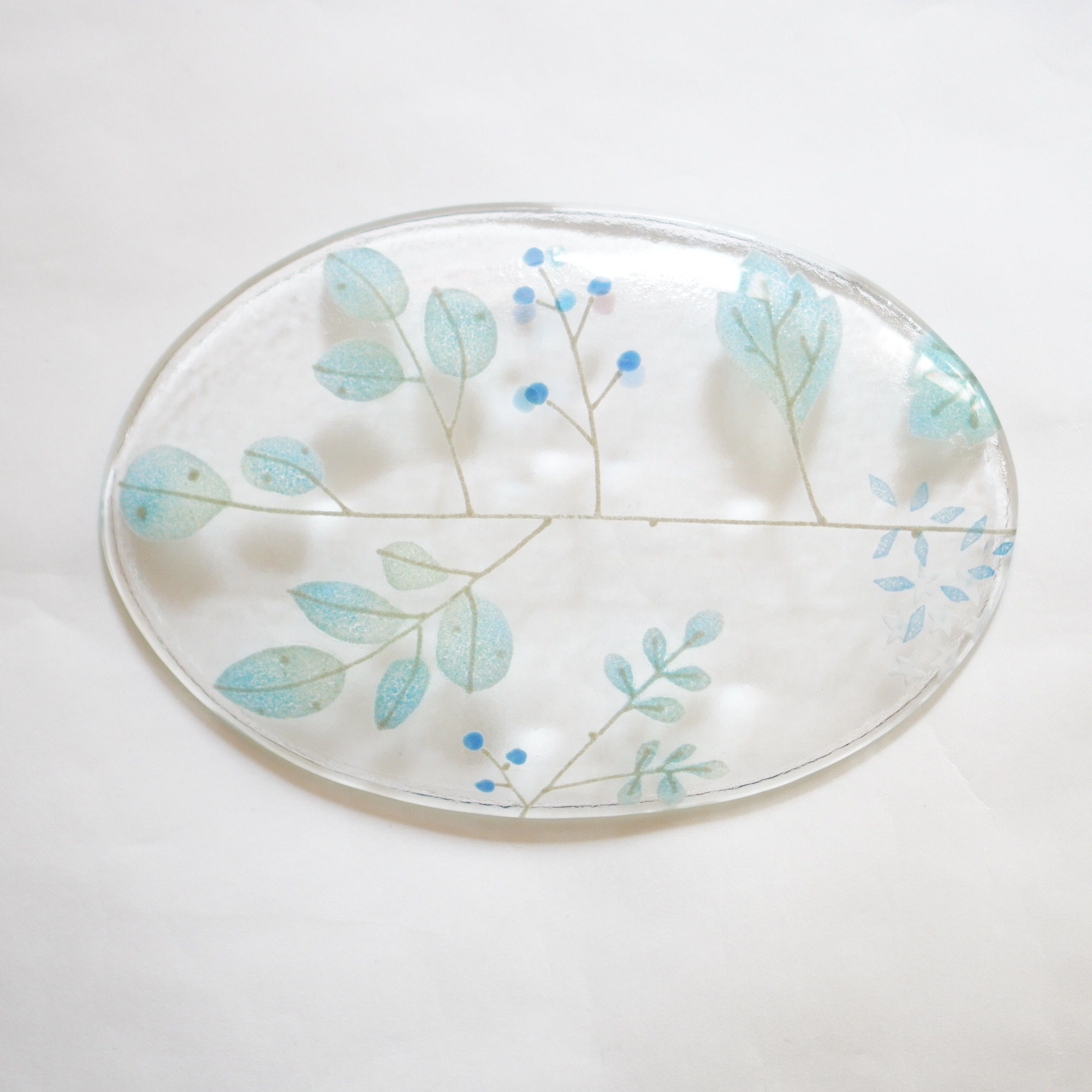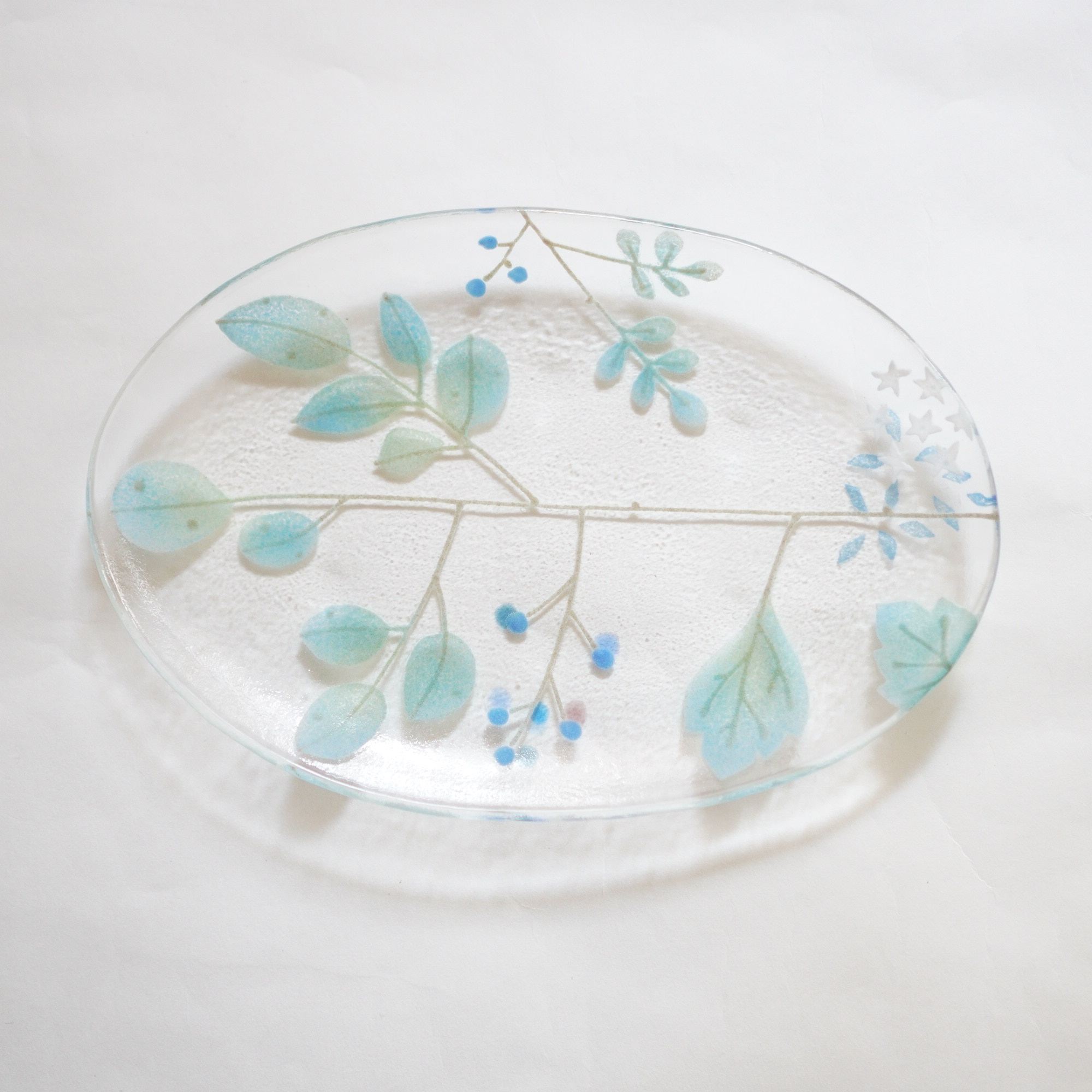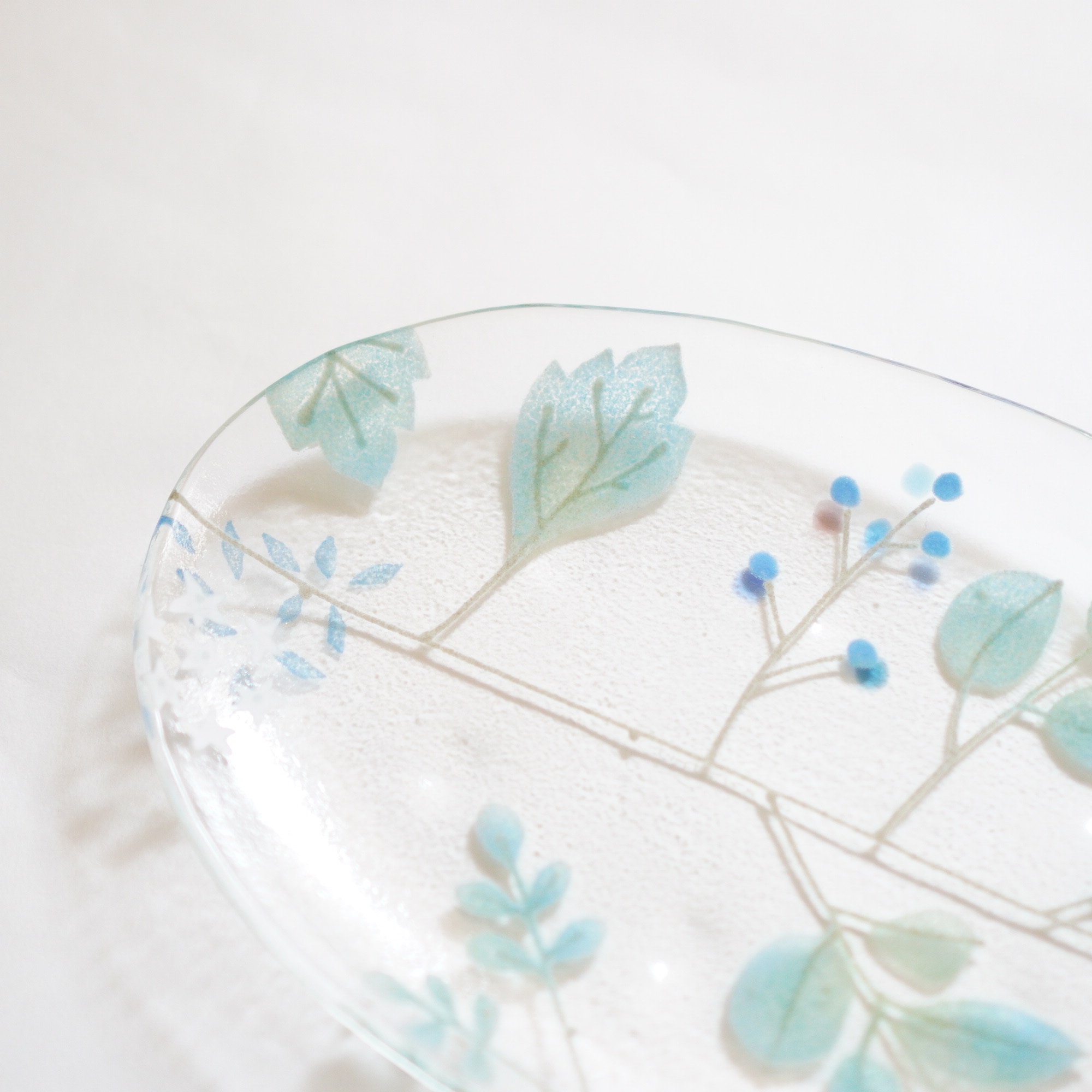 日々の暮らしが彩り、楽しく過ごせますように…と想いが込められた作品。板ガラスを重ね、焼き、かたちづくる“フュージング”や“スランピング”といった技法を用いて、やわらかな草花がそっと息づいているかのような作品を日々、制作されています。手書きで施された繊細な絵付けは手仕事ならではの、やさしい雰囲気を纏い、ふと心を和らげてくれます。