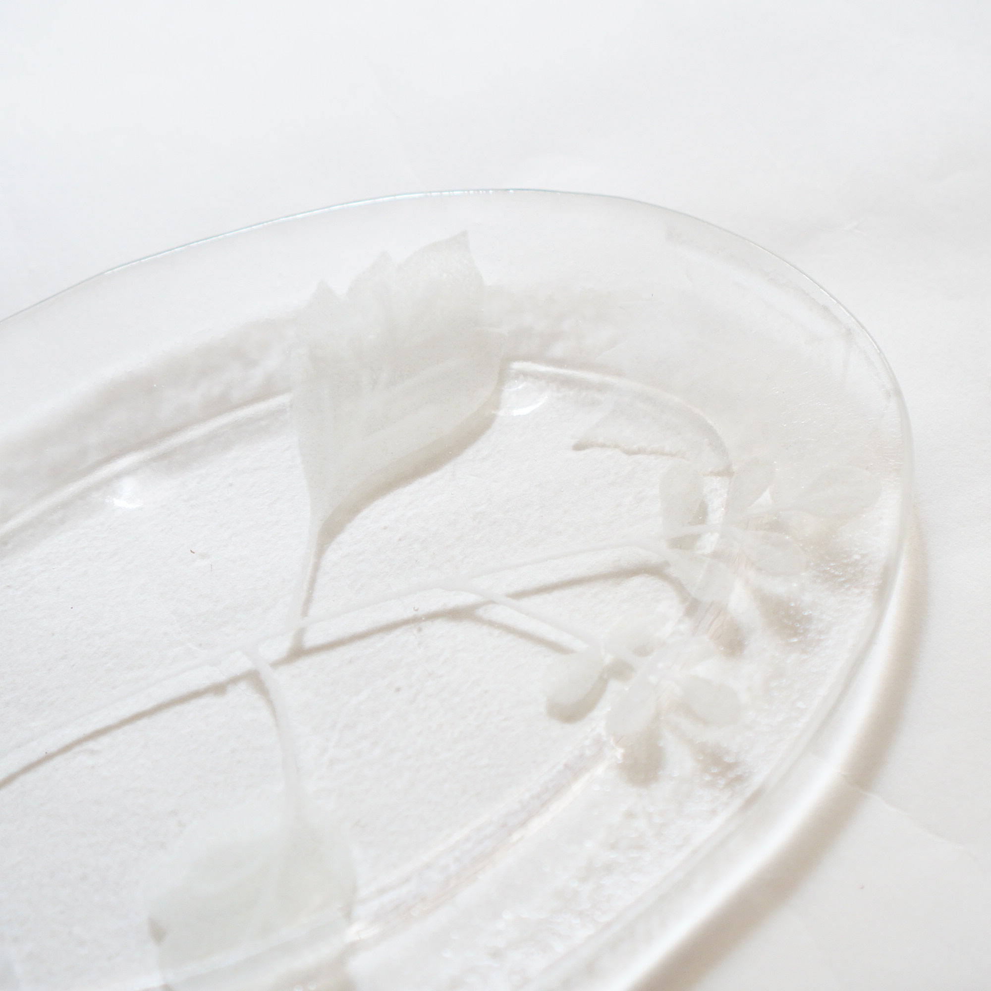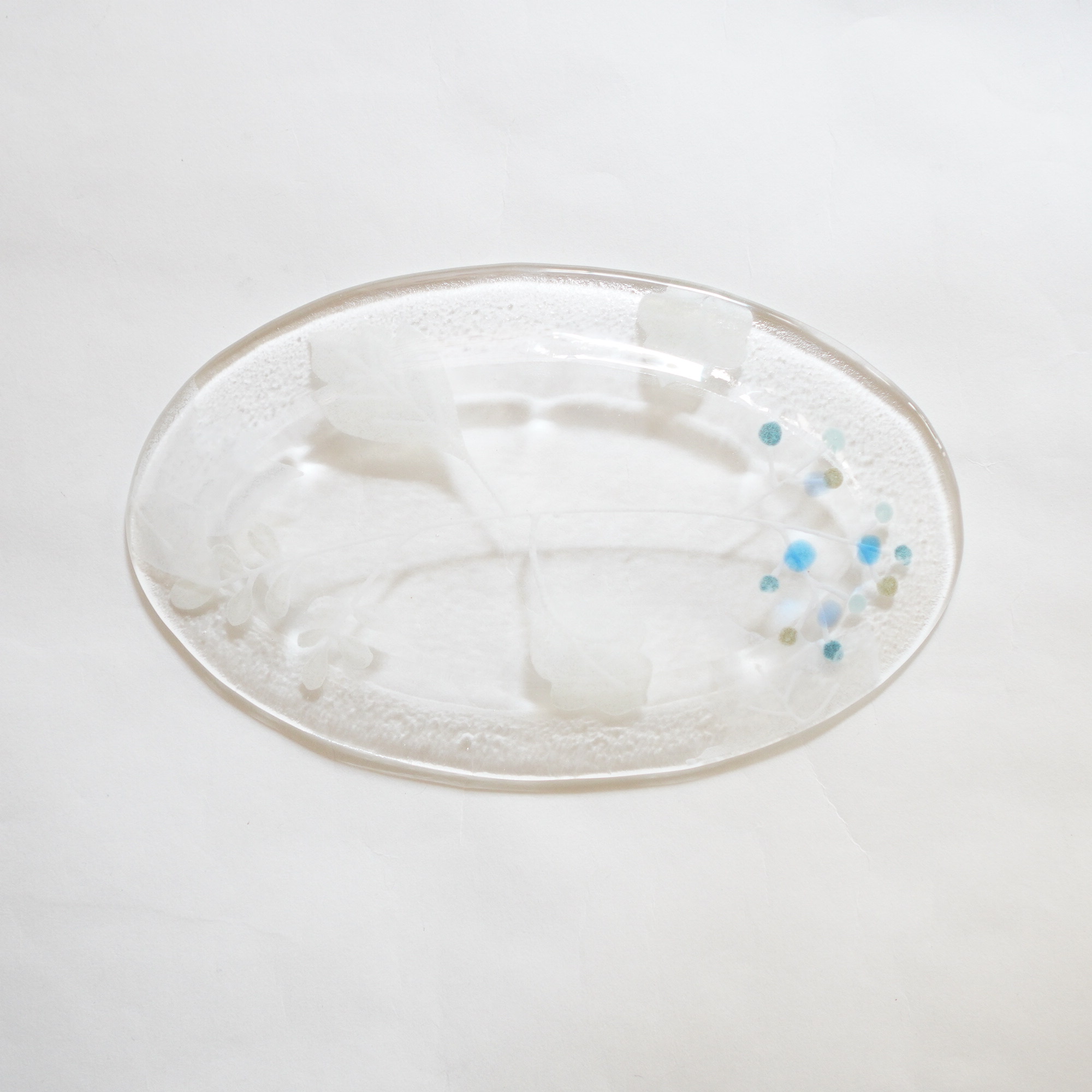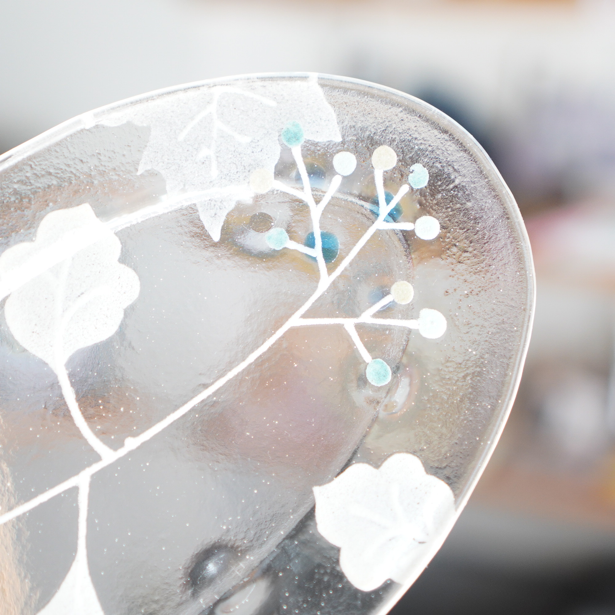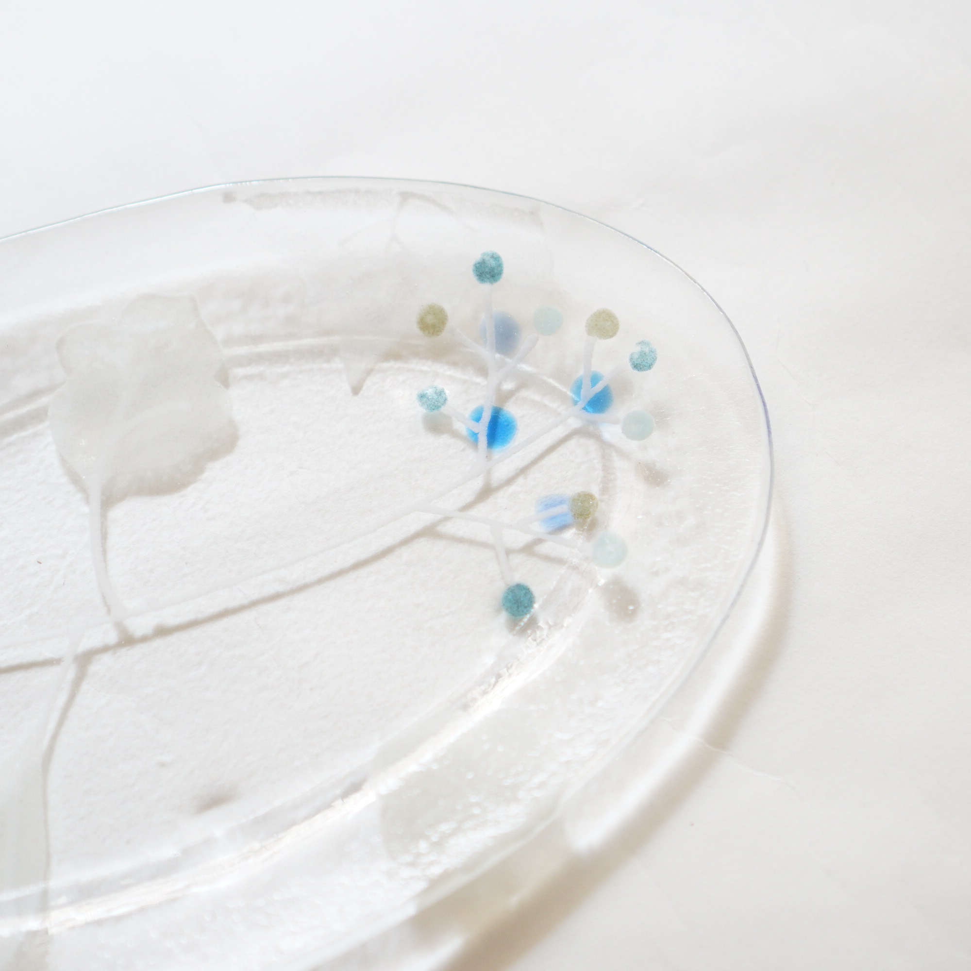 日々の暮らしが彩り、楽しく過ごせますように…と想いが込められた作品。板ガラスを重ね、焼き、かたちづくる“フュージング”や“スランピング”といった技法を用いて、やわらかな草花がそっと息づいているかのような作品を日々、制作されています。手書きで施された繊細な絵付けは手仕事ならではの、やさしい雰囲気を纏い、ふと心を和らげてくれます。
