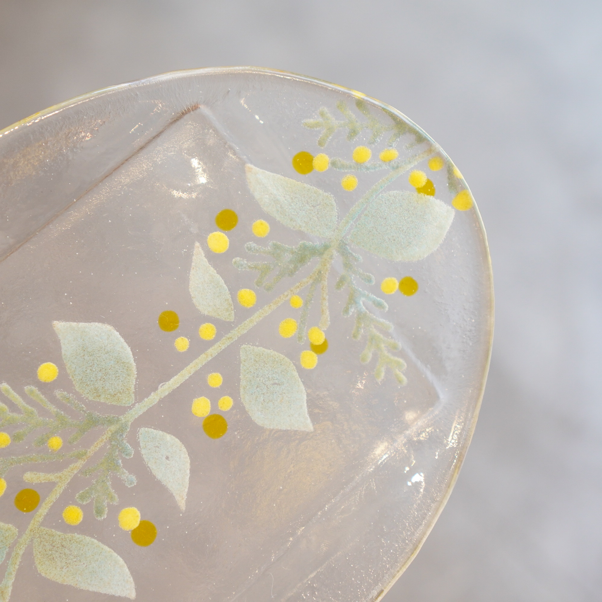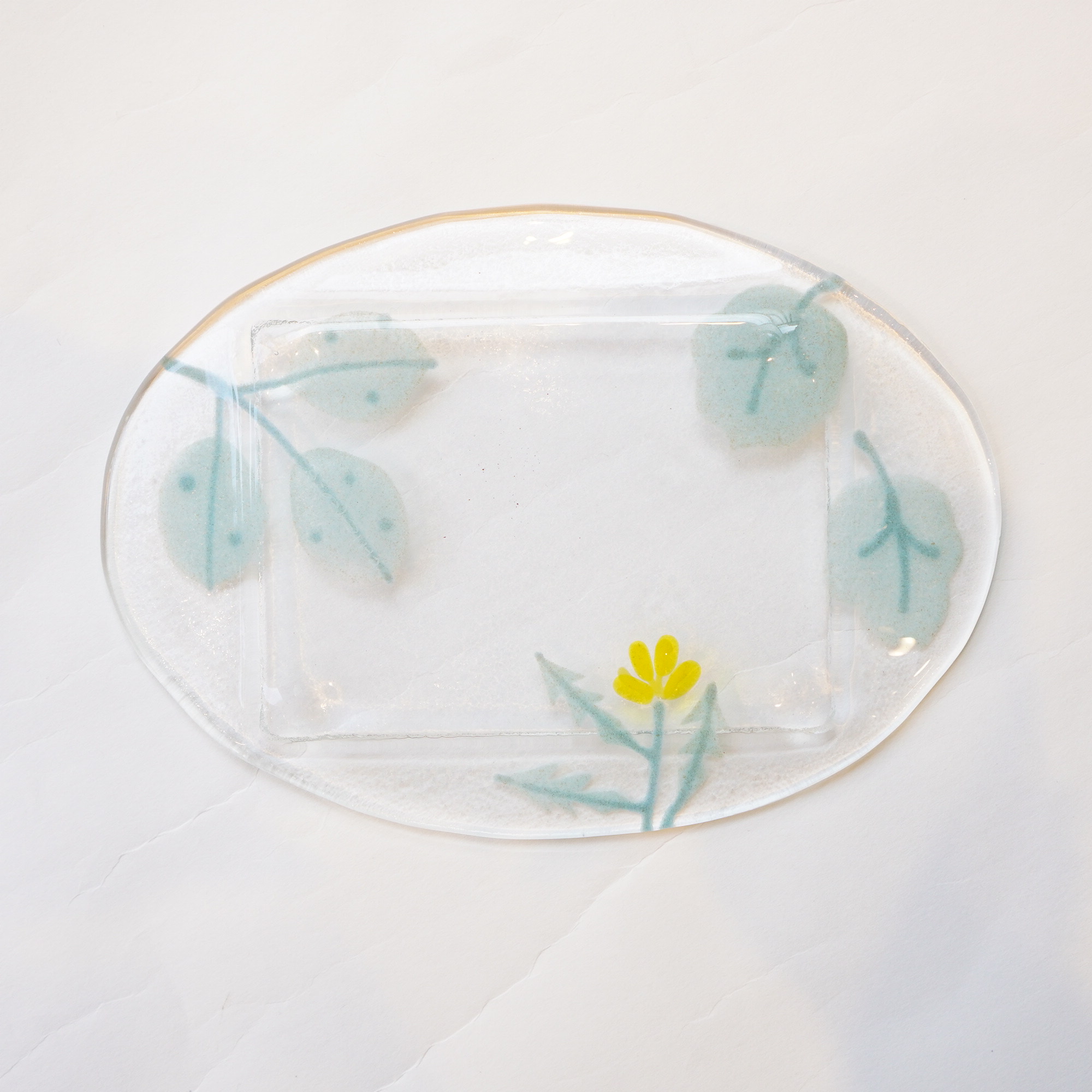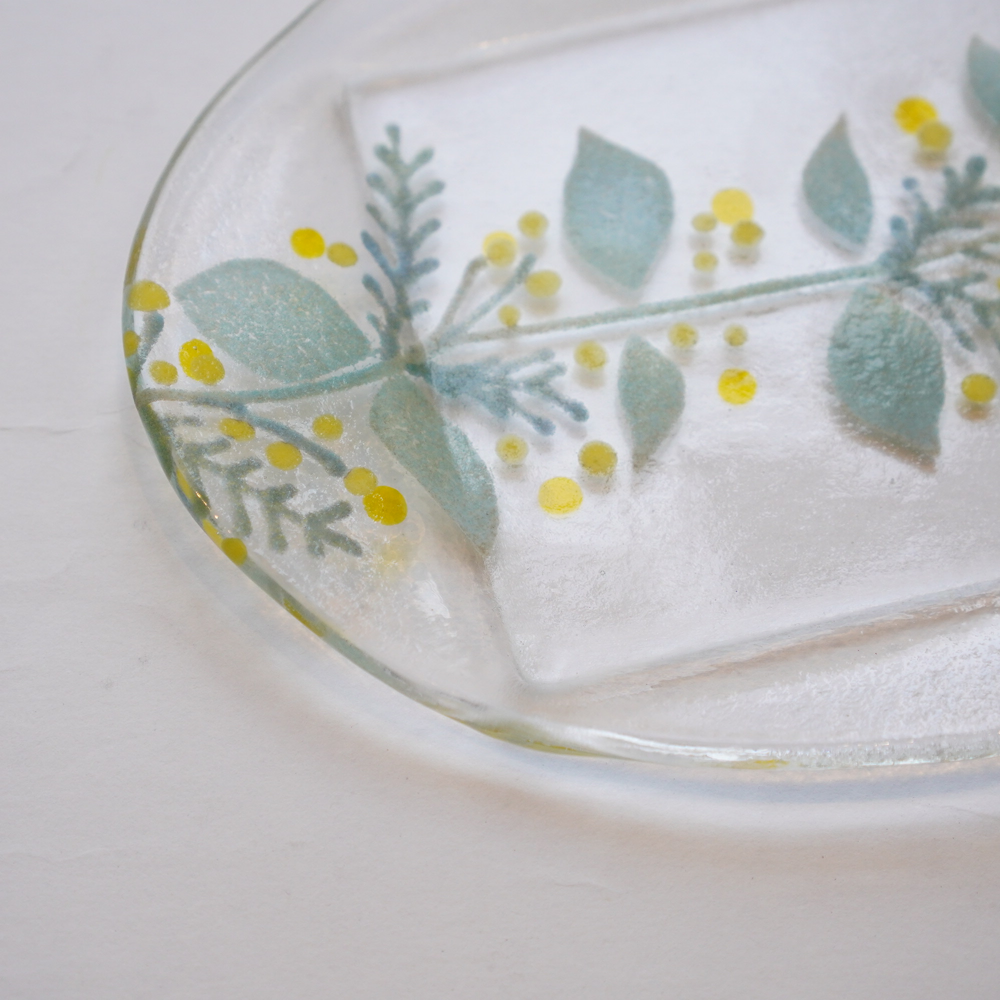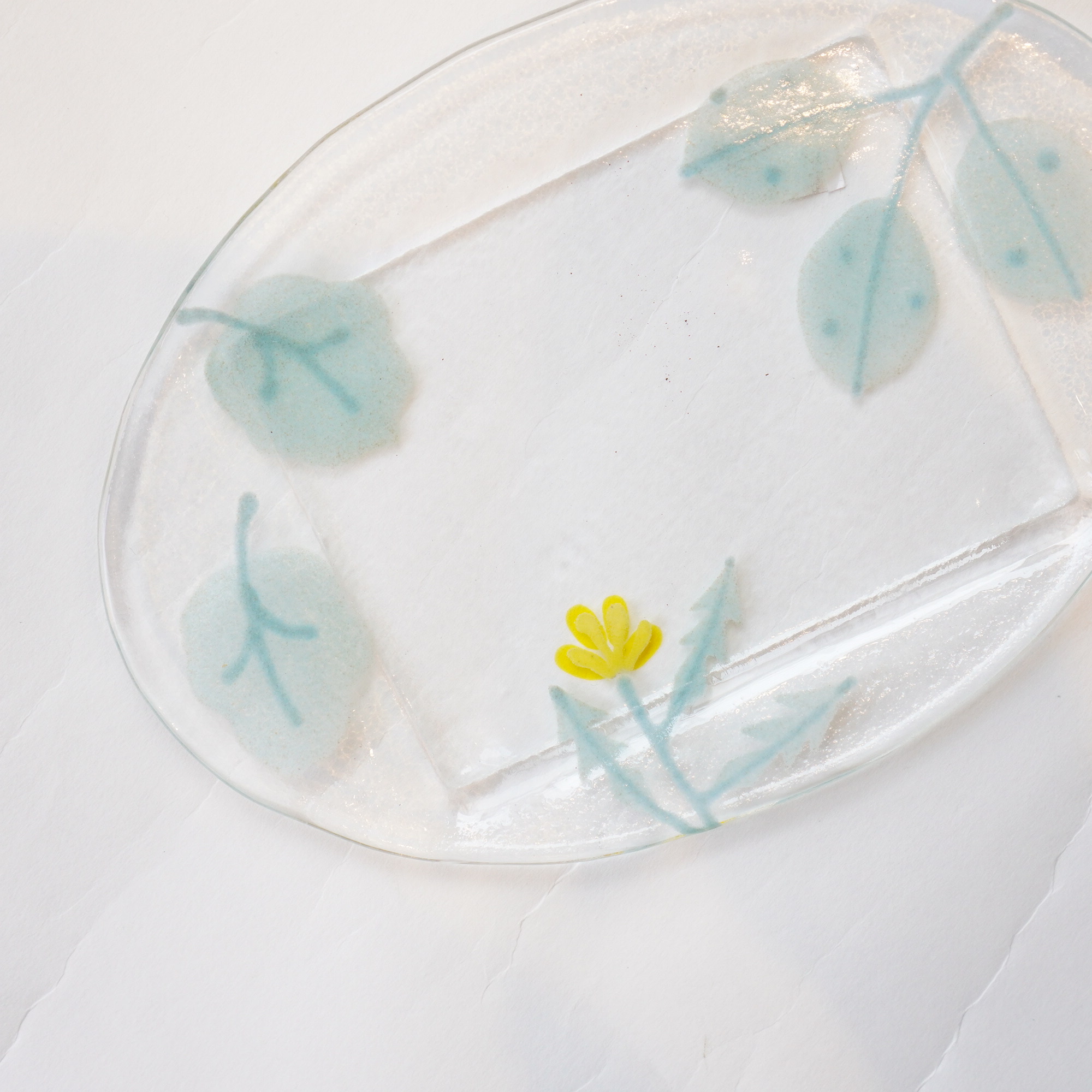 日々の暮らしが彩り、楽しく過ごせますように…と想いが込められた作品。板ガラスを重ね、焼き、かたちづくる“フュージング”や“スランピング”といった技法を用いて、やわらかな草花がそっと息づいているかのような作品を日々、制作されています。手書きで施された繊細な絵付けは手仕事ならではの、やさしい雰囲気を纏い、ふと心を和らげてくれます。