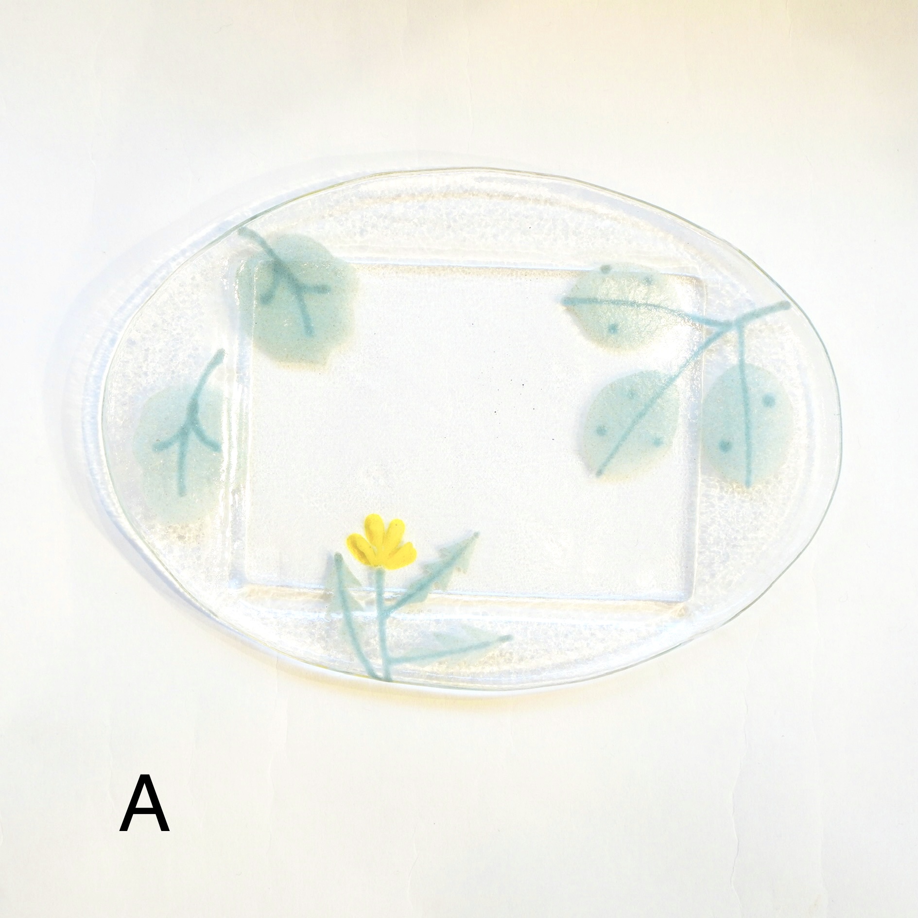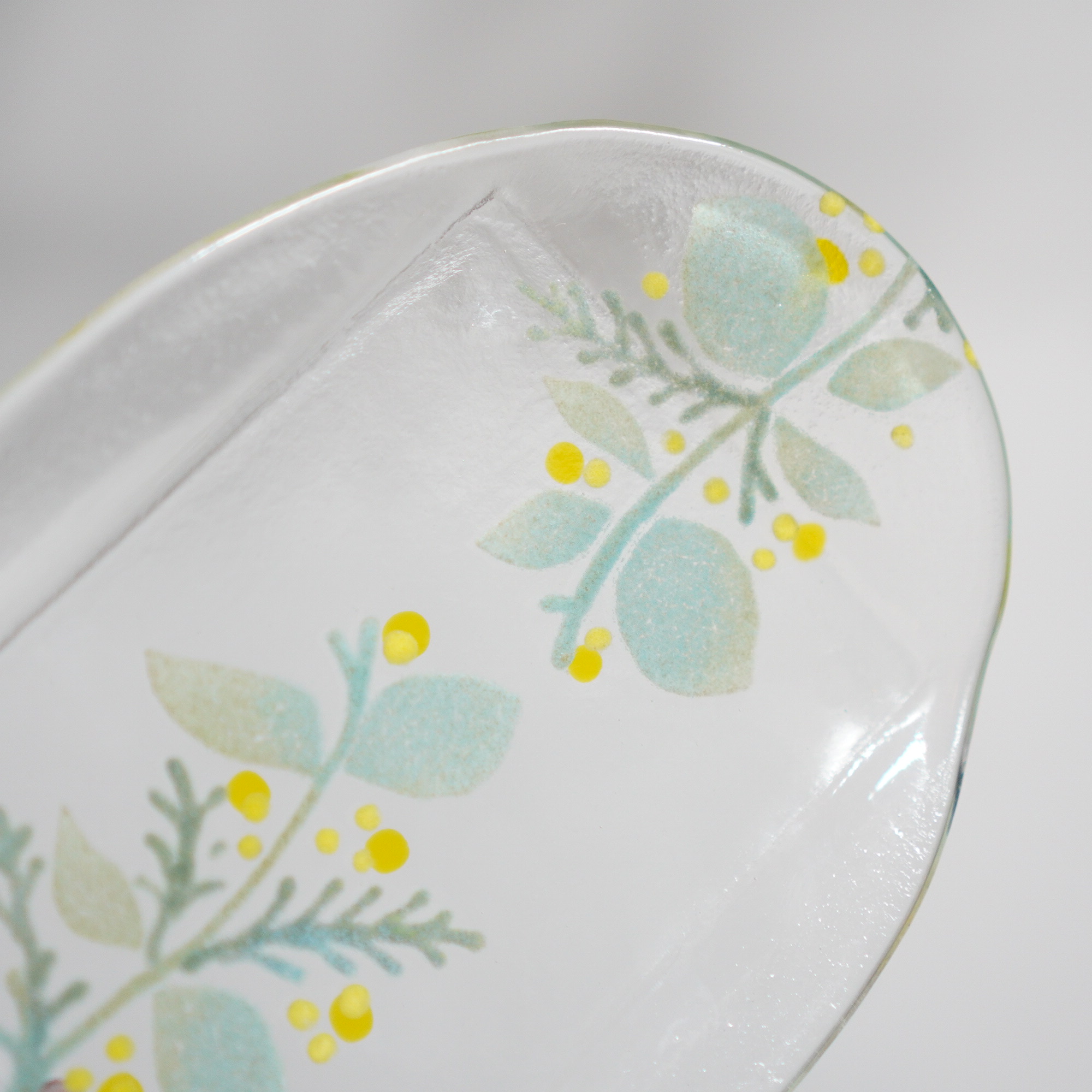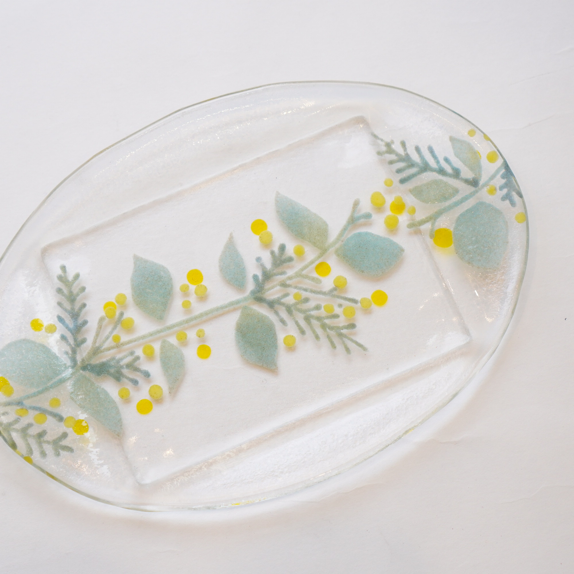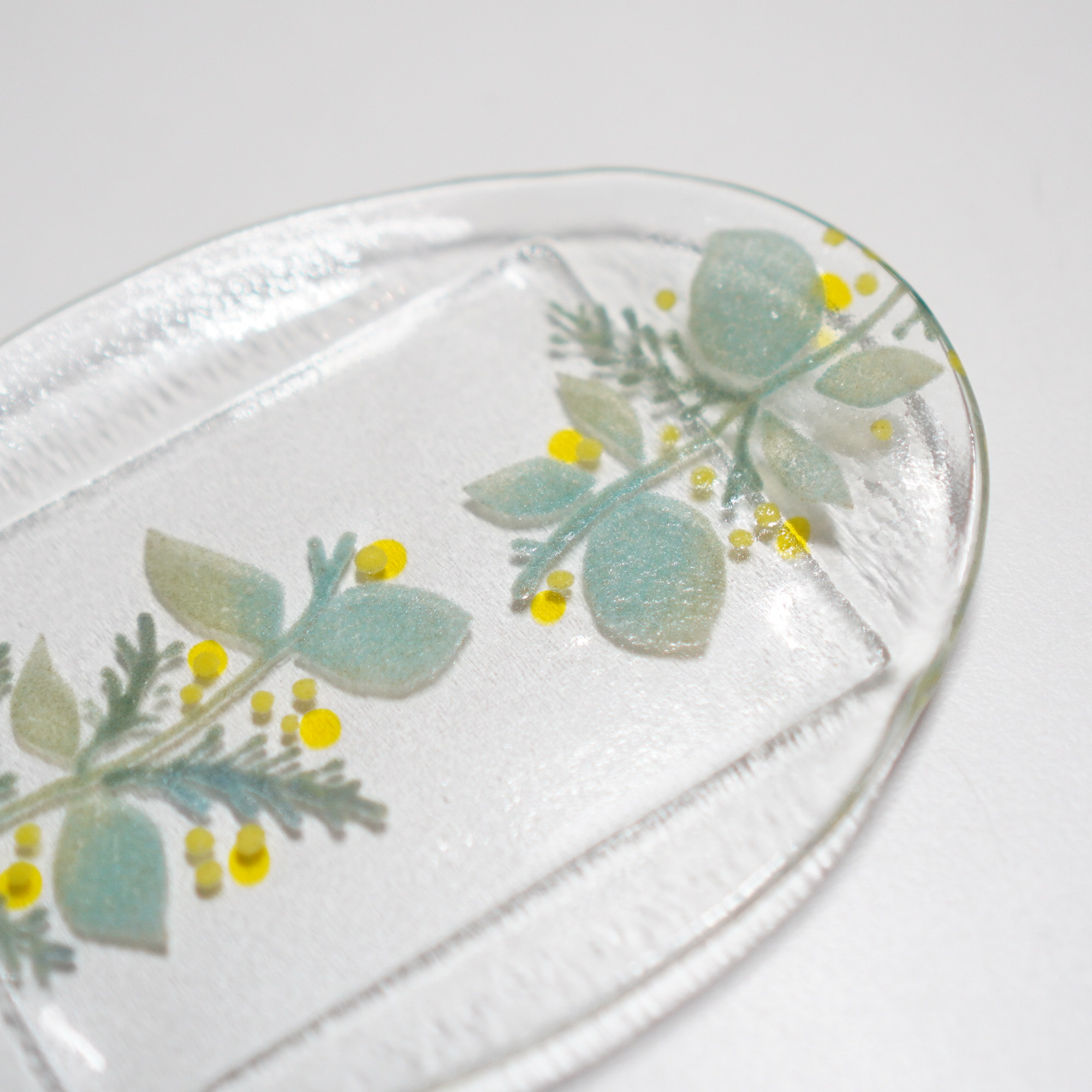 日々の暮らしが彩り、楽しく過ごせますように…と想いが込められた作品。板ガラスを重ね、焼き、かたちづくる“フュージング”や“スランピング”といった技法を用いて、やわらかな草花がそっと息づいているかのような作品を日々、制作されています。手書きで施された繊細な絵付けは手仕事ならではの、やさしい雰囲気を纏い、ふと心を和らげてくれます。