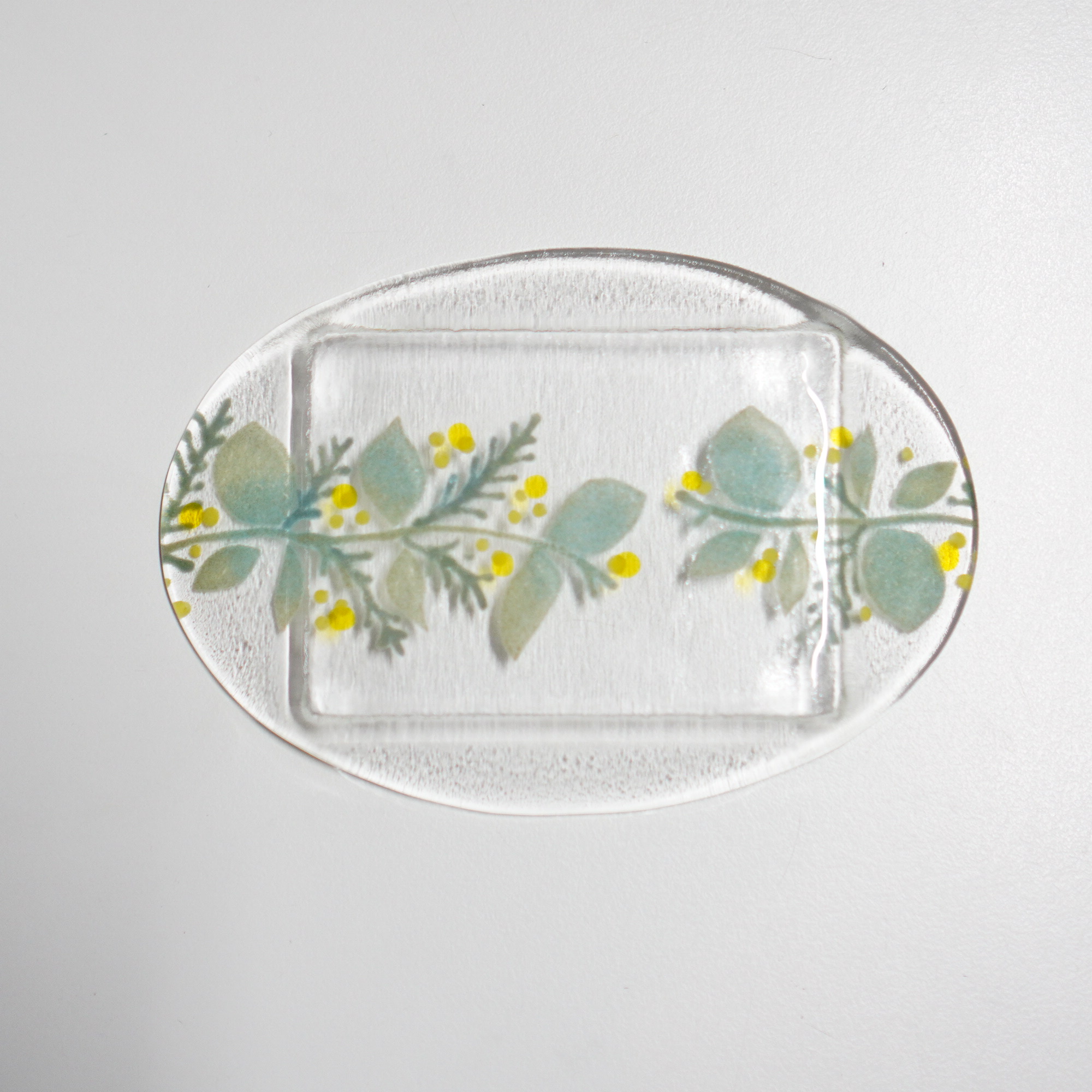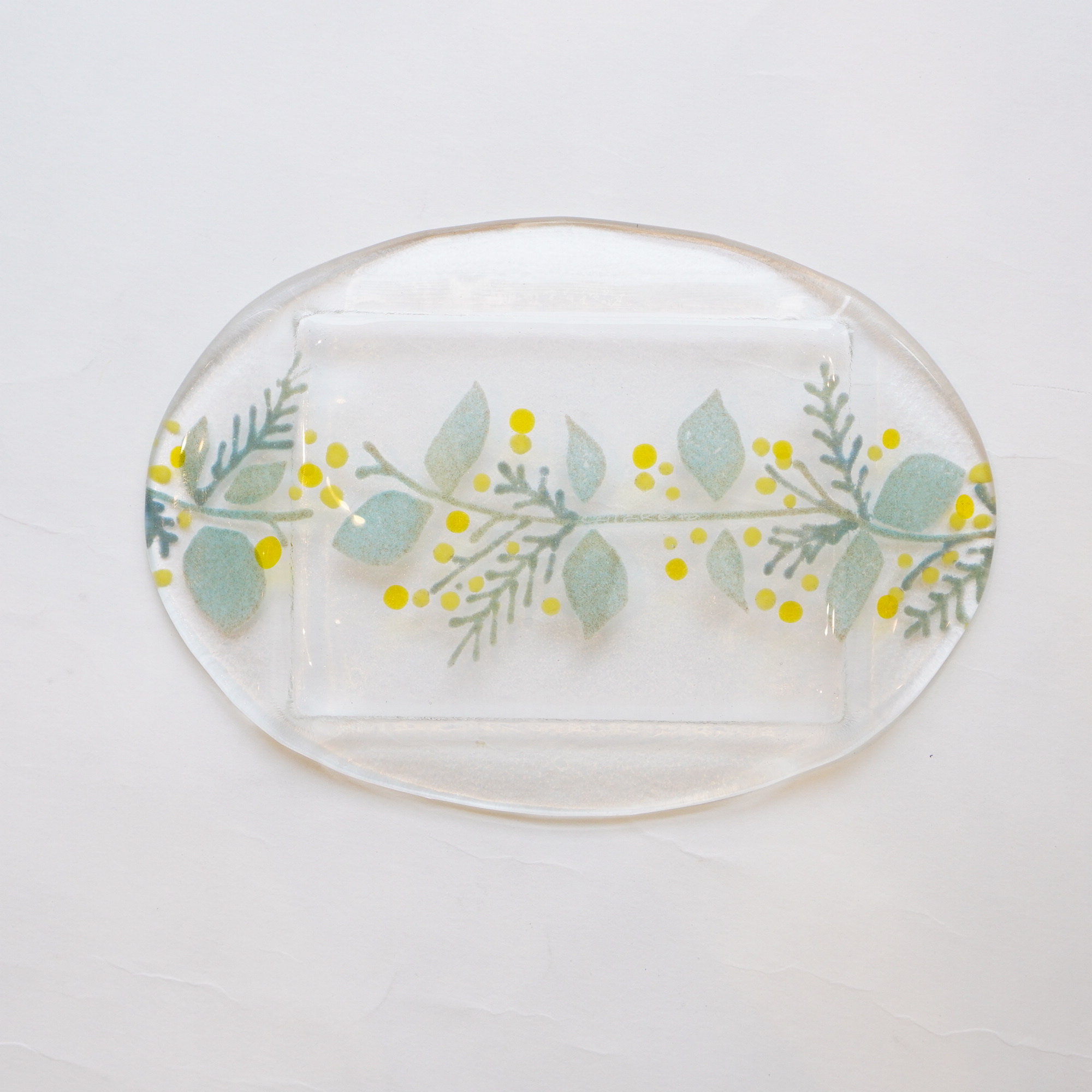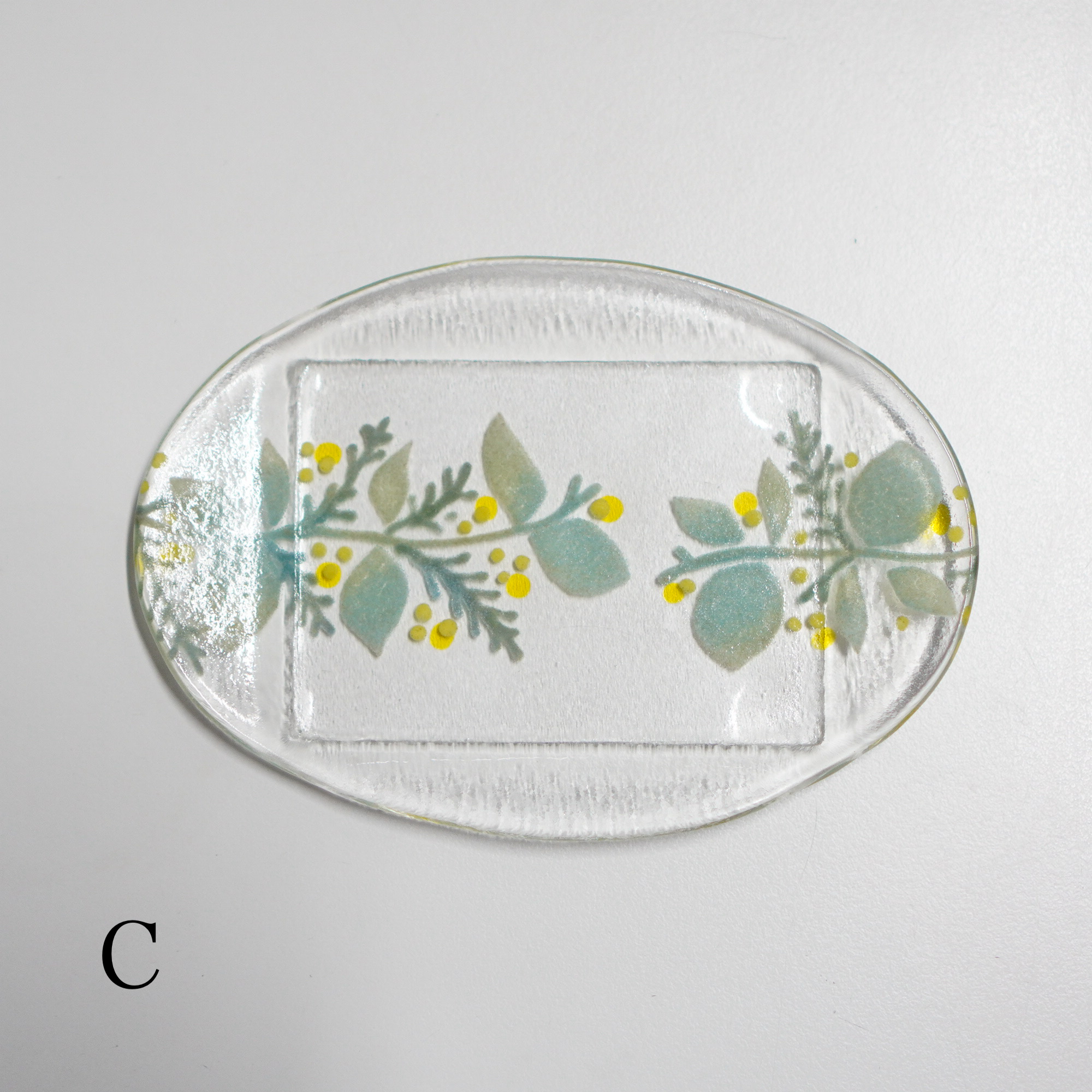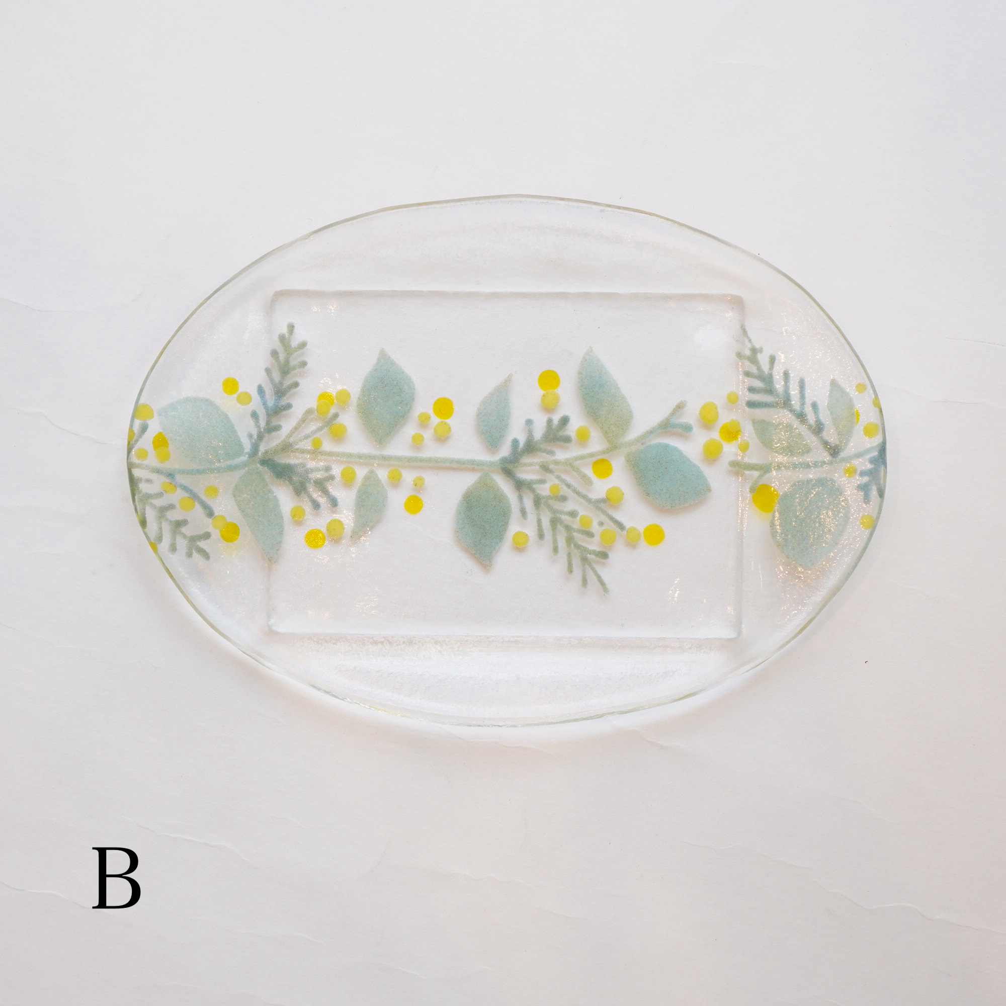日々の暮らしが彩り、楽しく過ごせますように…と想いが込められた作品。板ガラスを重ね、焼き、かたちづくる“フュージング”や“スランピング”といった技法を用いて、やわらかな草花がそっと息づいているかのような作品を日々、制作されています。手書きで施された繊細な絵付けは手仕事ならではの、やさしい雰囲気を纏い、ふと心を和らげてくれます。