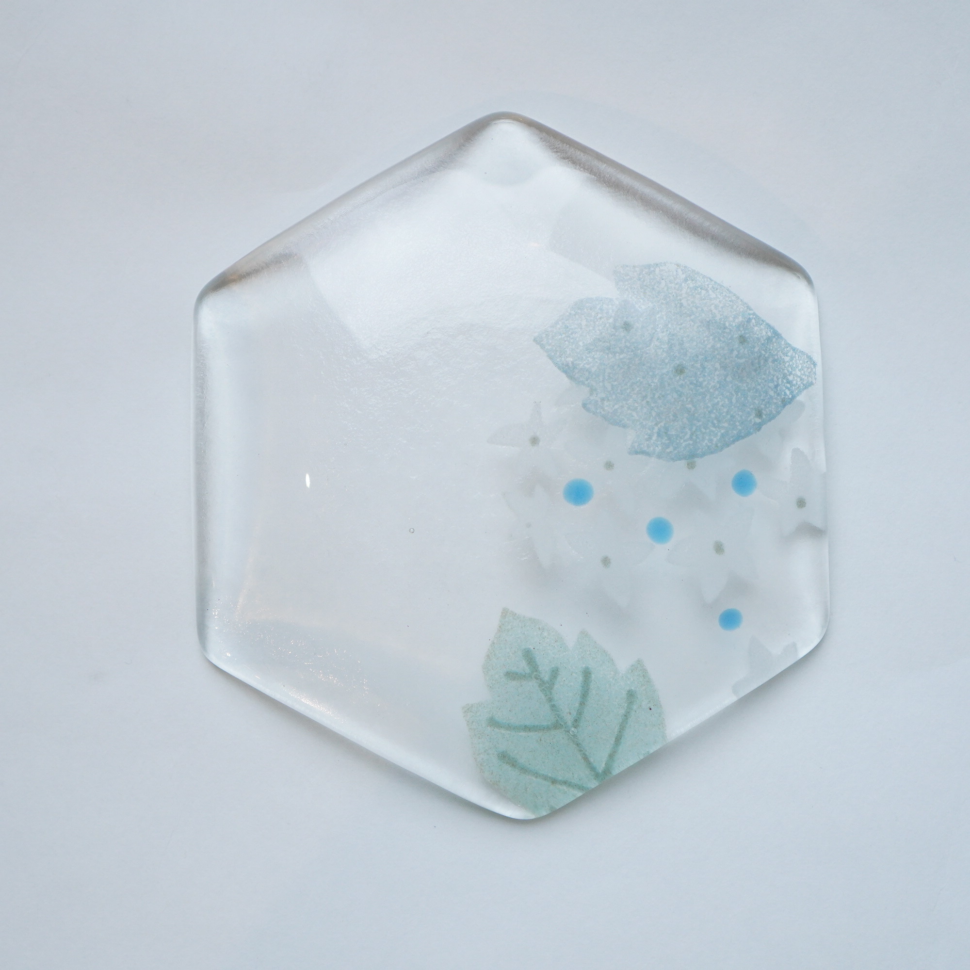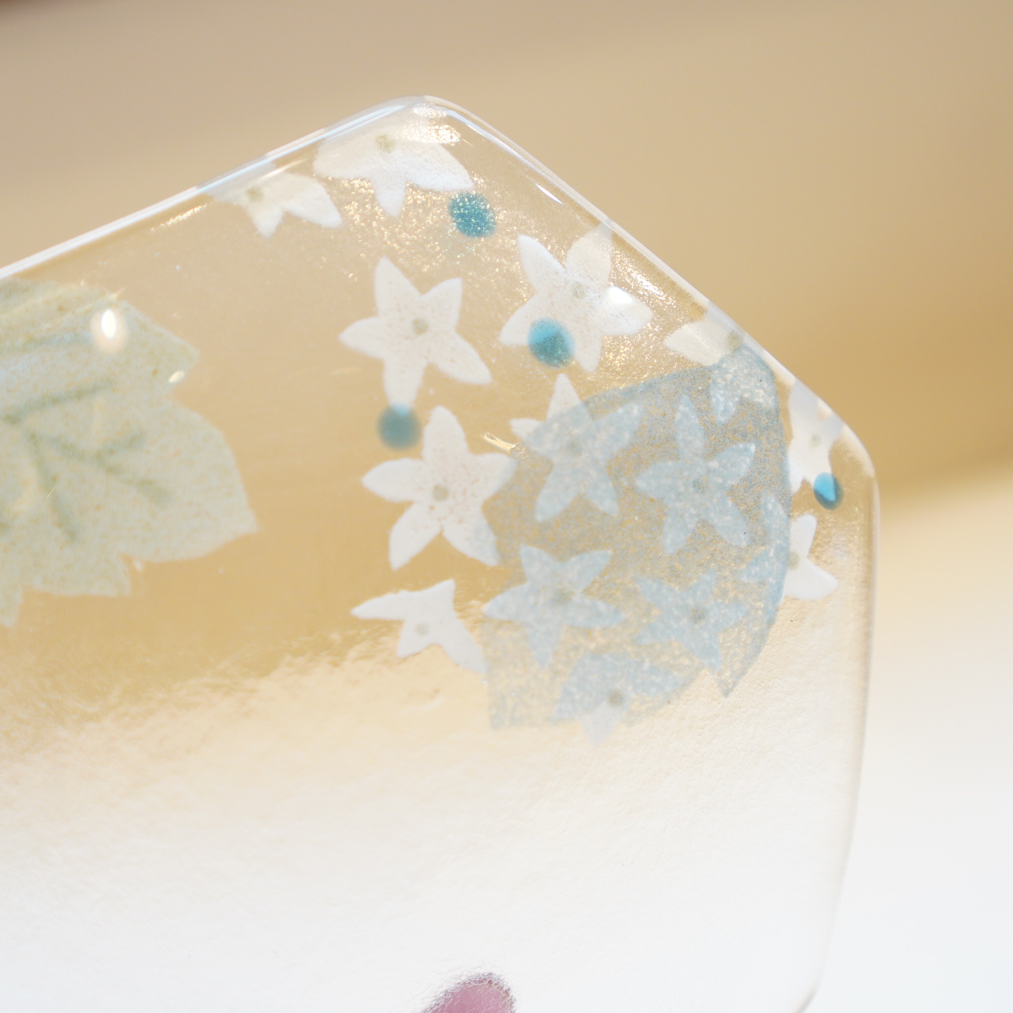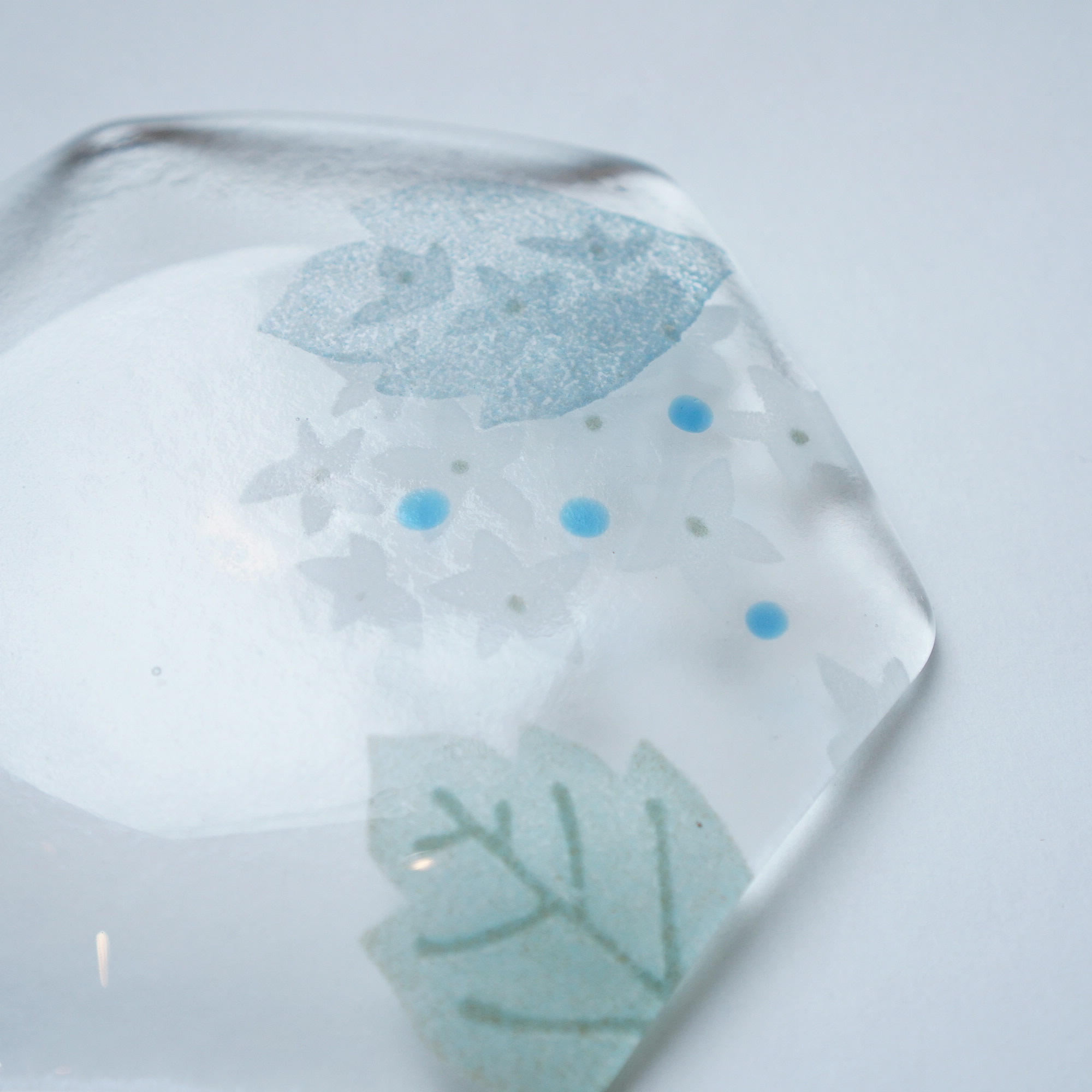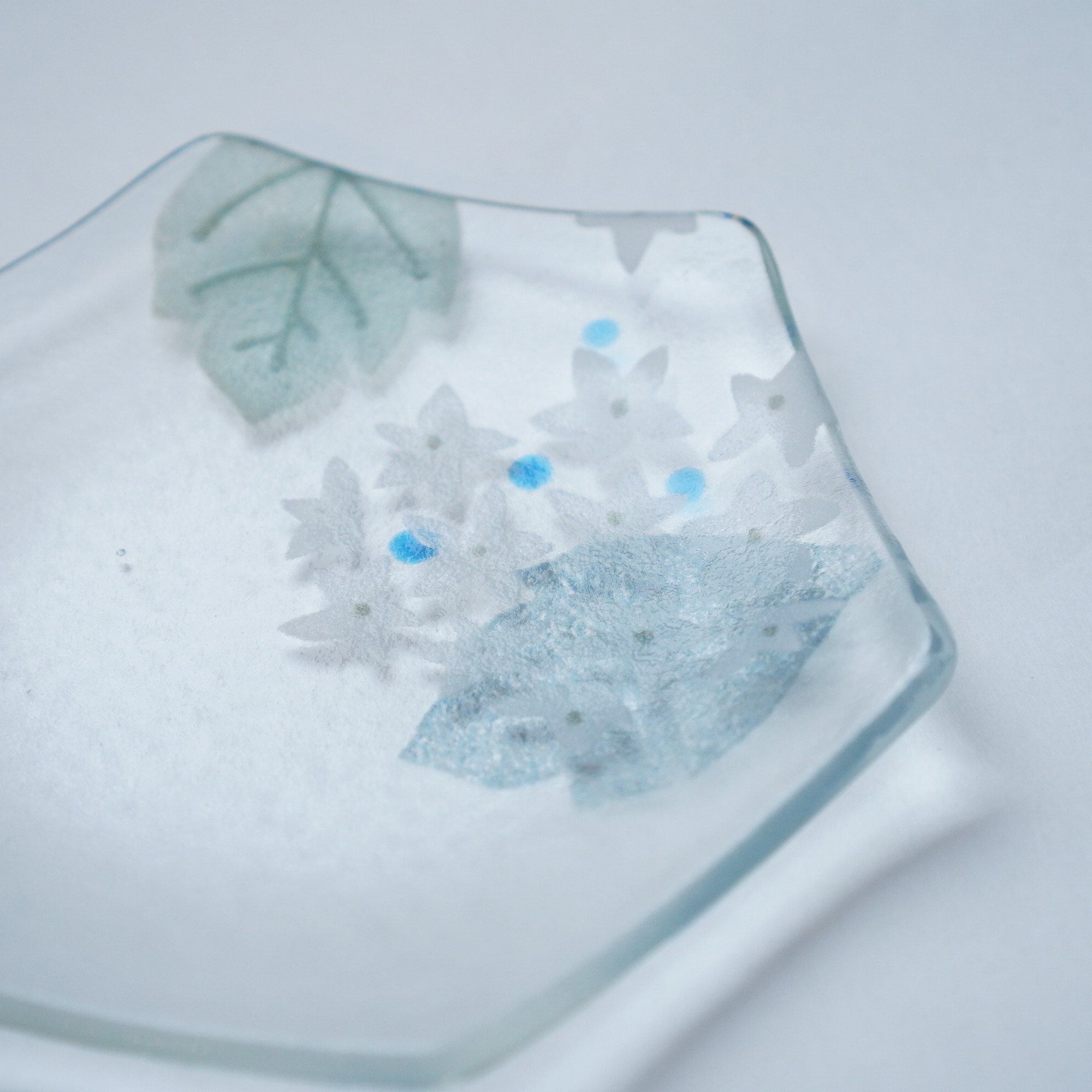 日々の暮らしが彩り、楽しく過ごせますように…と想いが込められた作品。板ガラスを重ね、焼き、かたちづくる“フュージング”や“スランピング”といった技法を用いて、やわらかな草花がそっと息づいているかのような作品を日々、制作されています。手書きで施された繊細な絵付けは手仕事ならではの、やさしい雰囲気を纏い、ふと心を和らげてくれます。