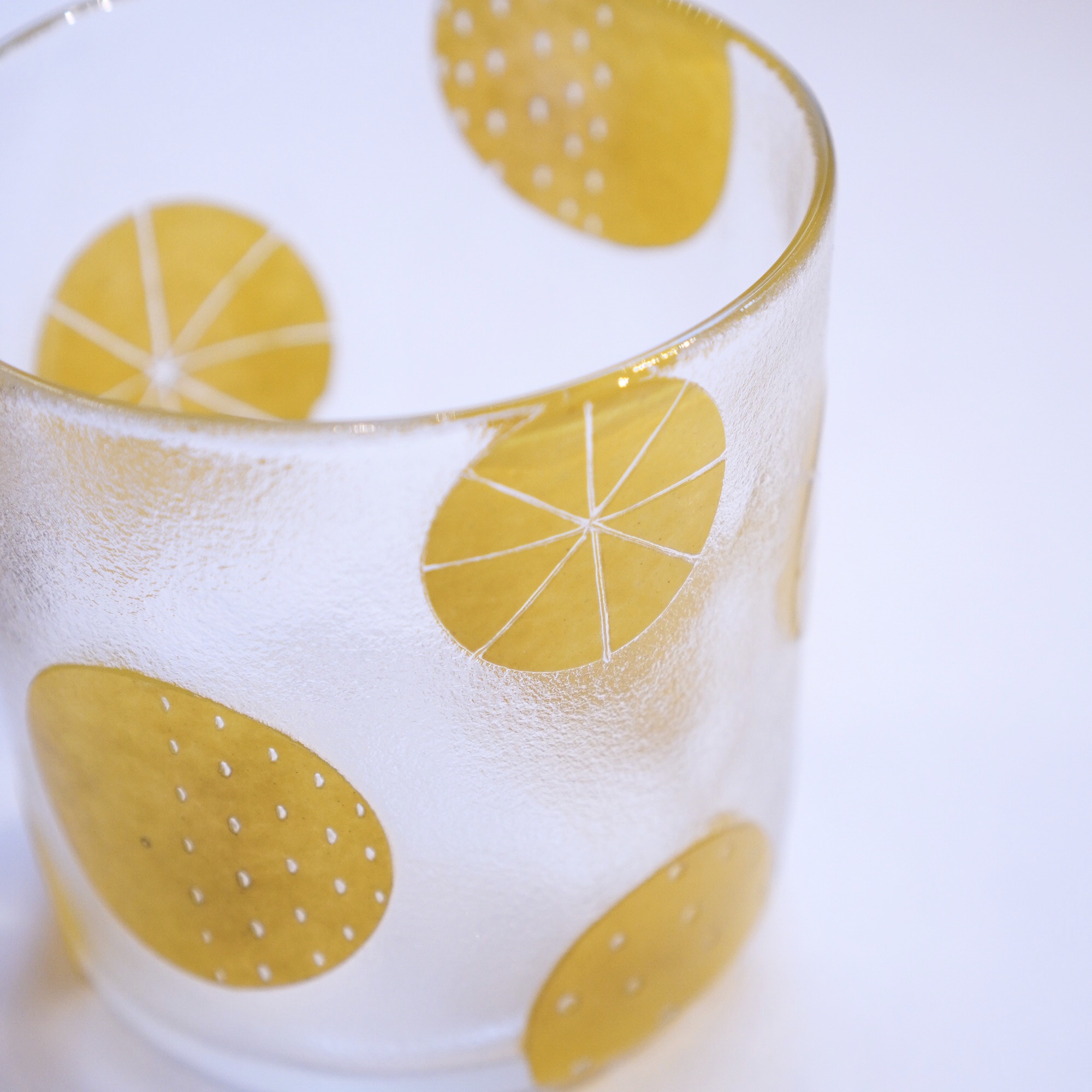 器を使うたびに、心躍るような瞬間を感じてほしいという想いを込めて、日々の暮らしで出逢う、キレイな街並みやアートからインスピレーションを得て制作された作品。吹きガラスでひとつひとつ丁寧につくられ、サンドブラストで時間をかけて削って生まれる細やかな模様は、凛と美しく唯一無二の1点物です。光を通す度に変わる表情にもご注目ください。
