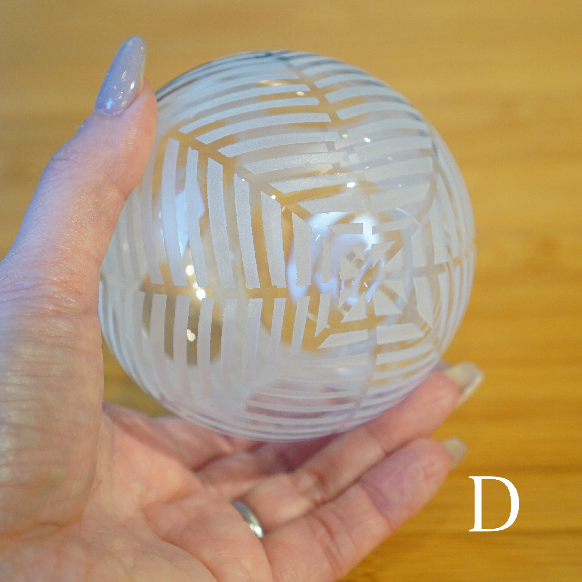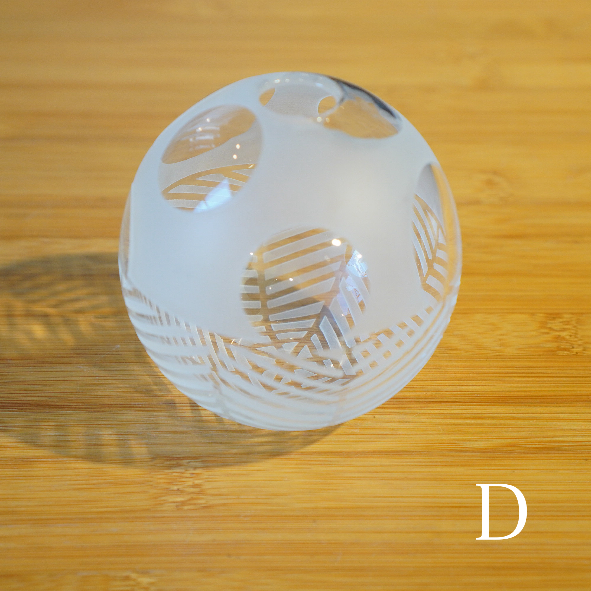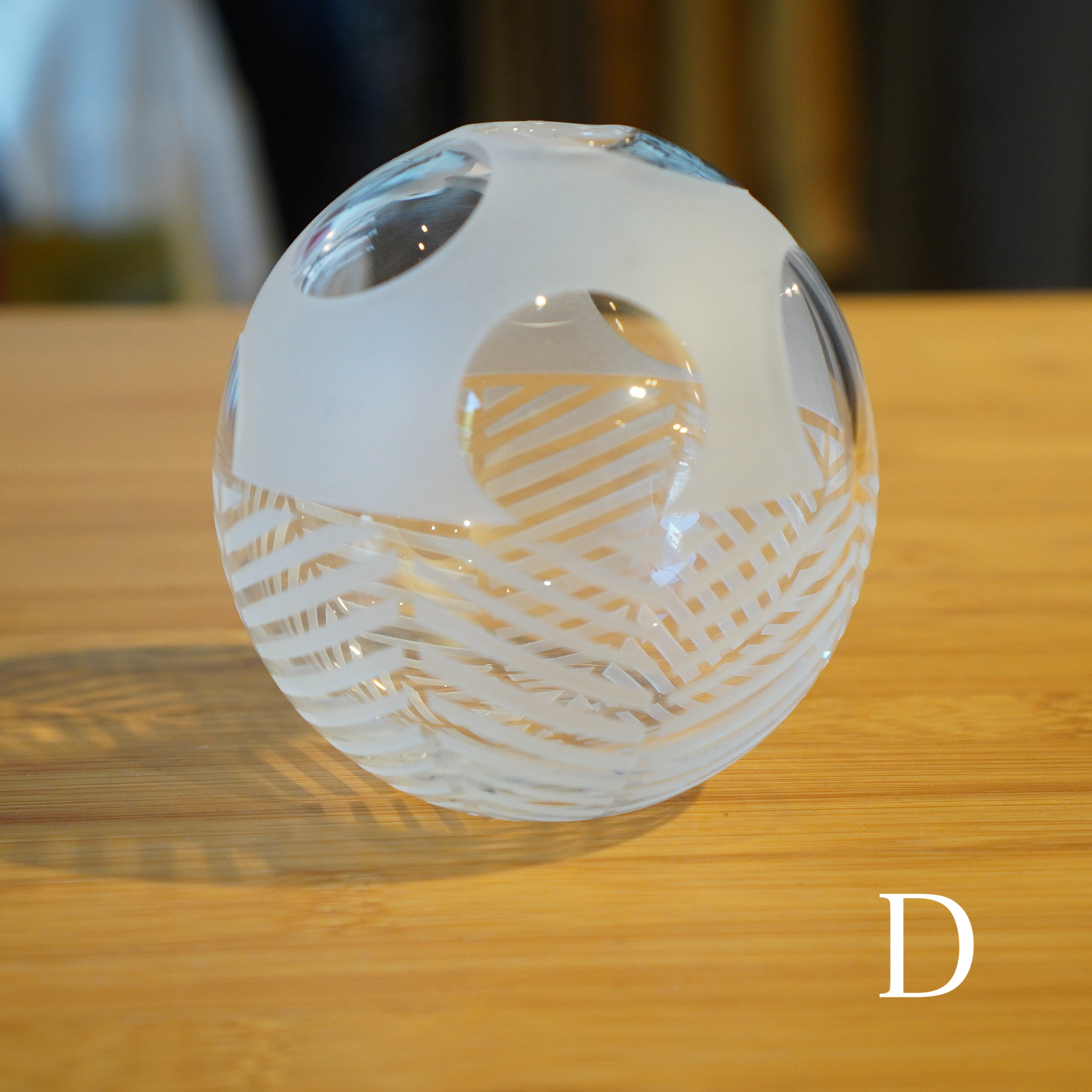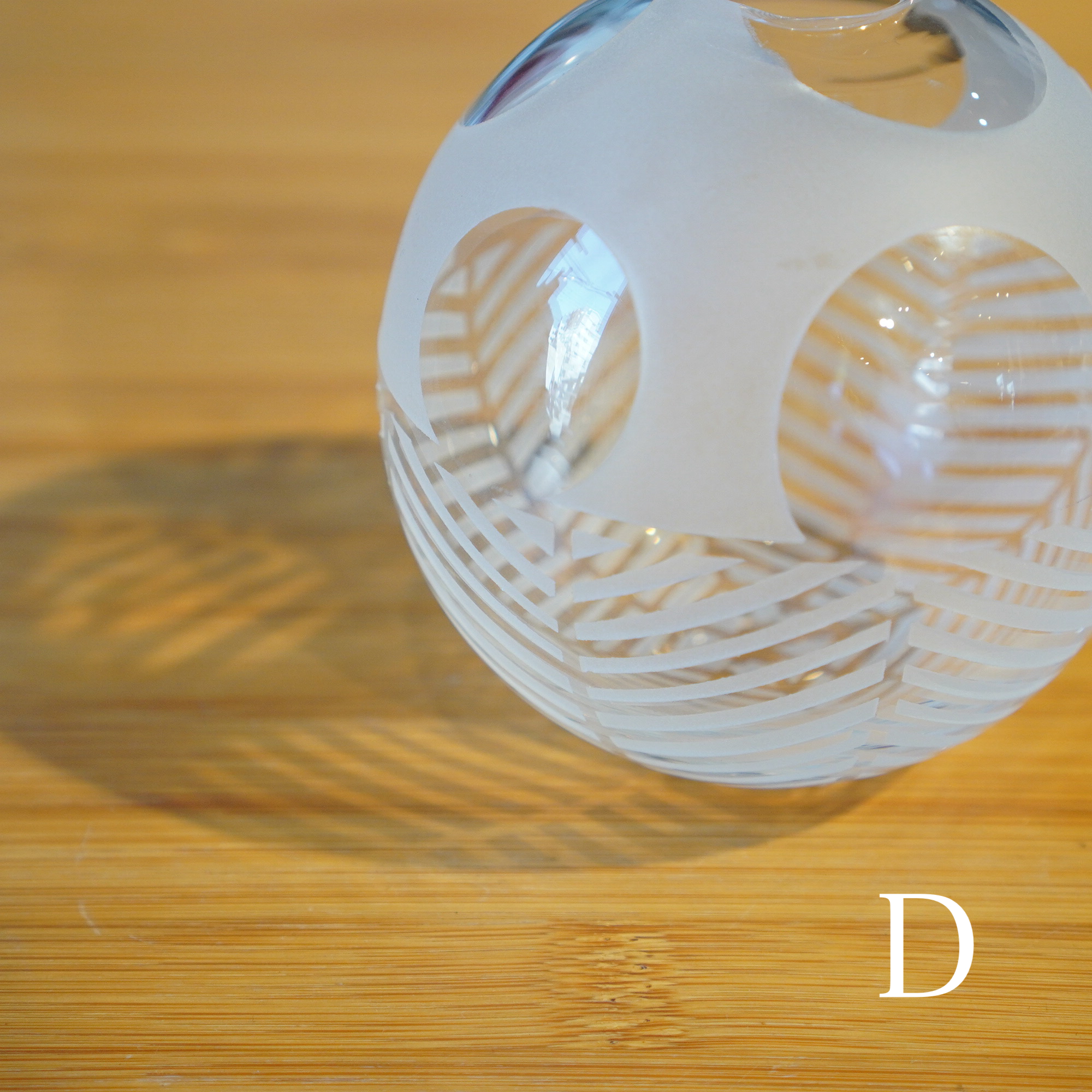 器を使うたびに、心躍るような瞬間を感じてほしいという想いを込めて、日々の暮らしで出逢う、キレイな街並みやアートからインスピレーションを得て制作された作品。吹きガラスでひとつひとつ丁寧につくられ、サンドブラストで時間をかけて削って生まれる細やかな模様は、凛と美しく唯一無二の1点物です。光を通す度に変わる表情にもご注目ください。