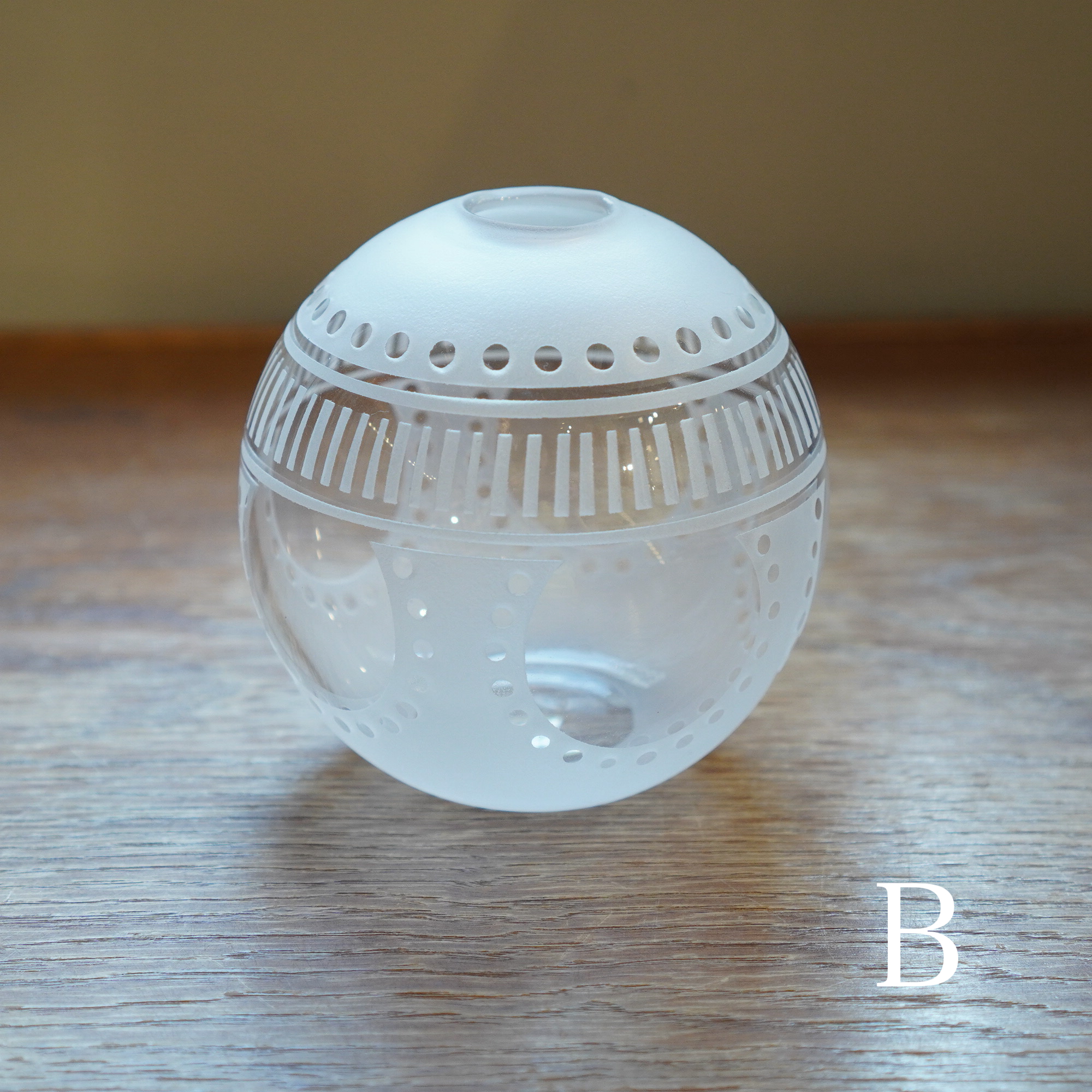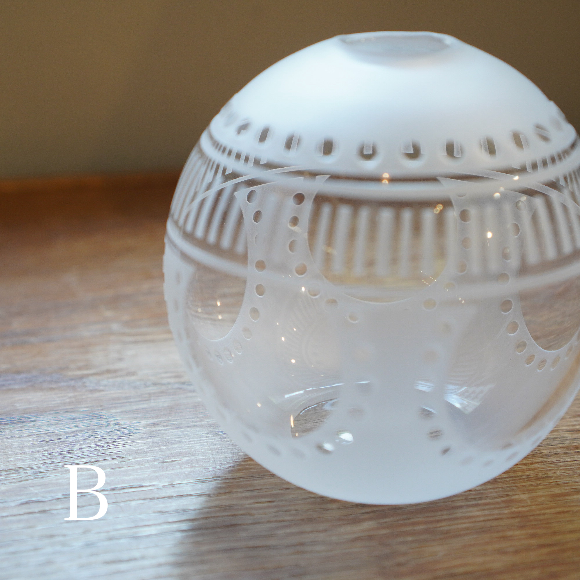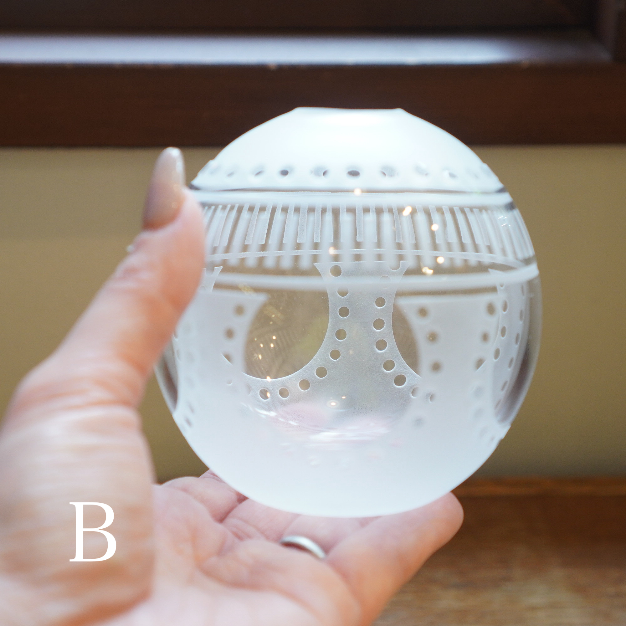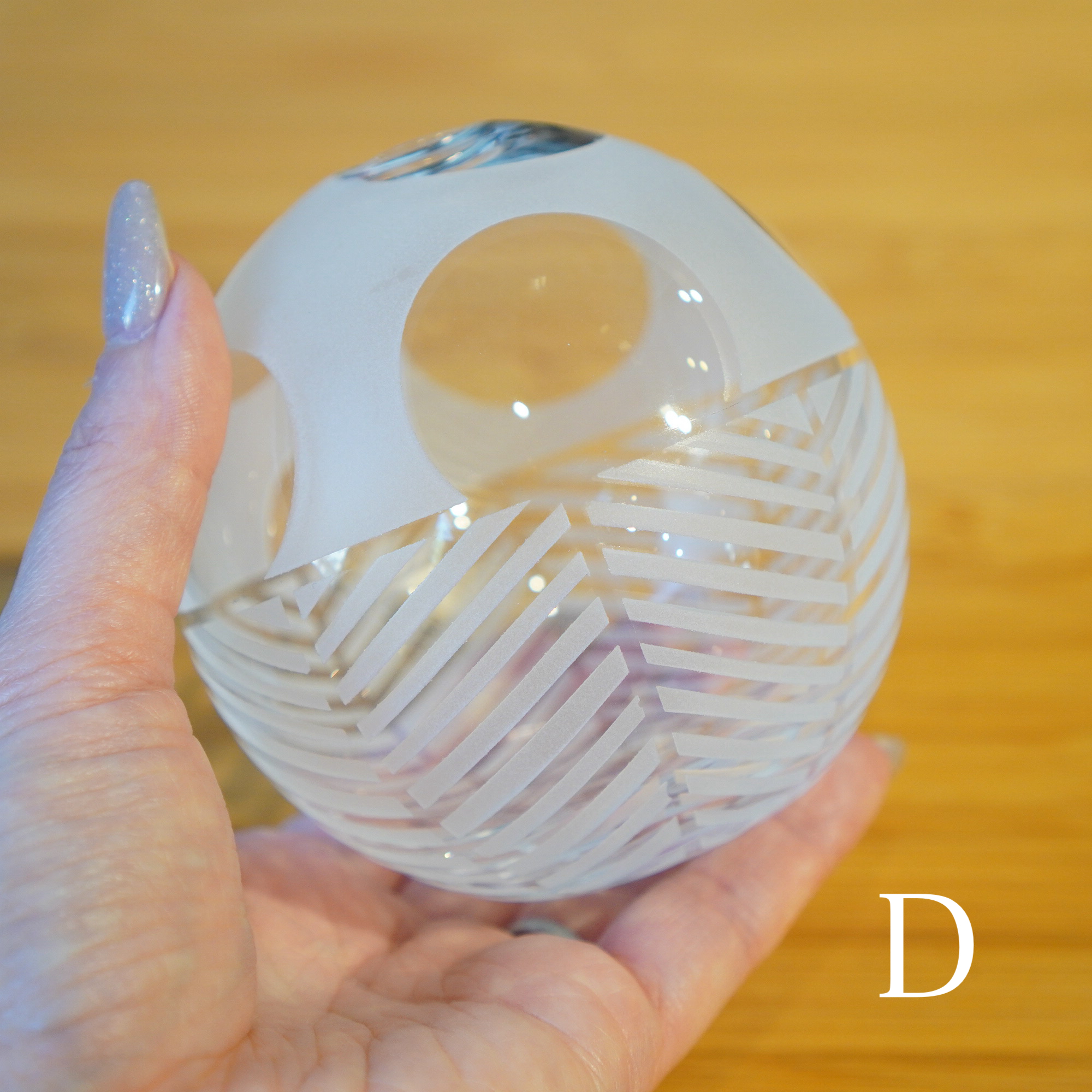 器を使うたびに、心躍るような瞬間を感じてほしいという想いを込めて、日々の暮らしで出逢う、キレイな街並みやアートからインスピレーションを得て制作された作品。吹きガラスでひとつひとつ丁寧につくられ、サンドブラストで時間をかけて削って生まれる細やかな模様は、凛と美しく唯一無二の1点物です。光を通す度に変わる表情にもご注目ください。
